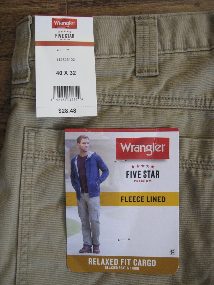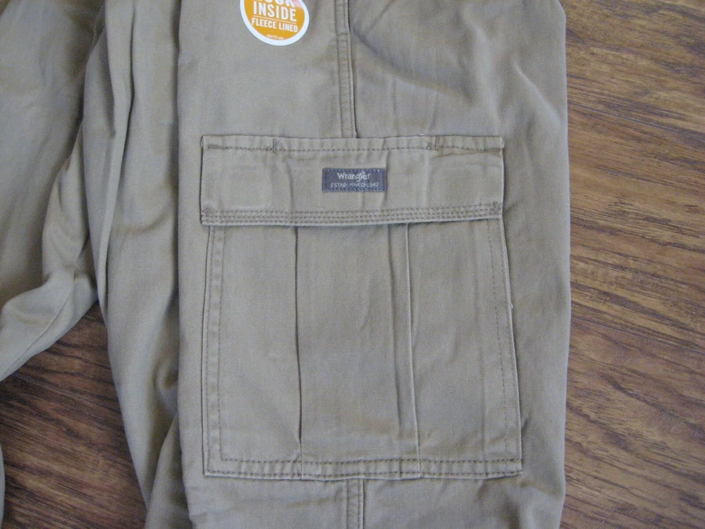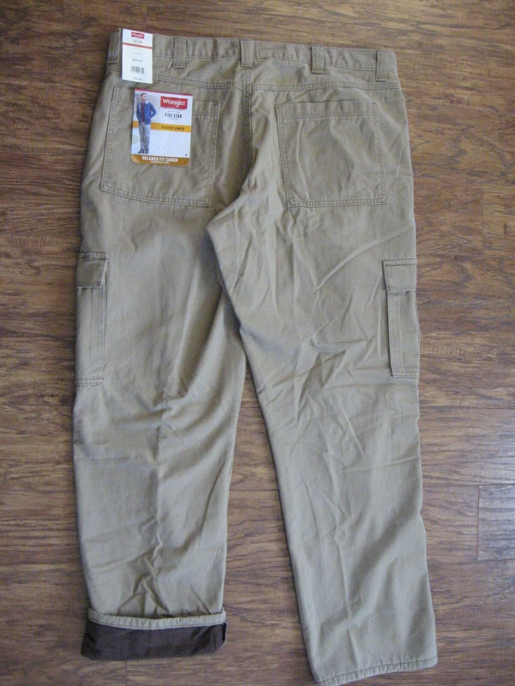 Brand new with tag. Never worn. One pant leg is still factory "pinned" back to show fleece. Tan color with plaid fleece. Tagged as 40 x 32. See actual measurements below. Measurements taken with garment laying flat: Waist: 42" Rise: 14" Inseam: 32-1/2" Check out all the pictures for details.