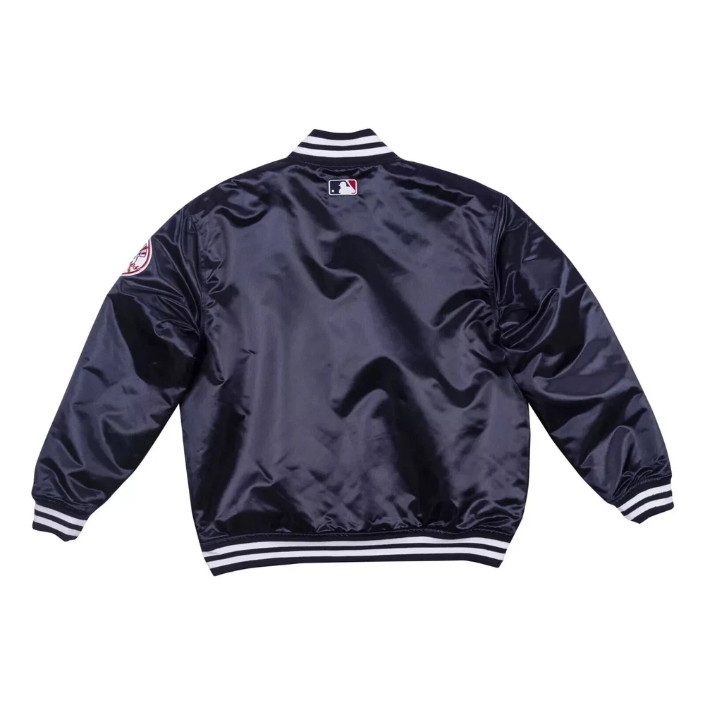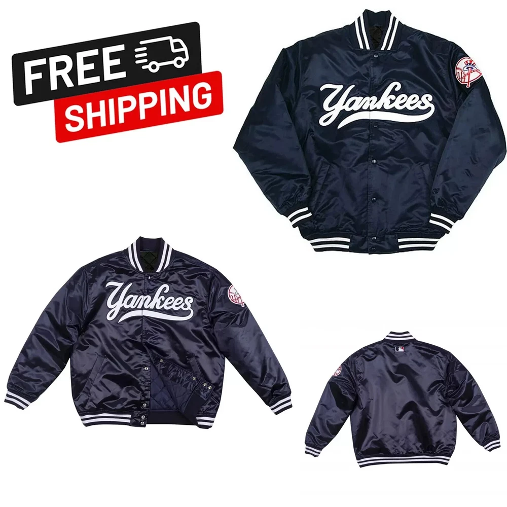 NY Yankees Vintage 90s Athletic Jacket Blue Satin Bomber Style Varsity Jackets Material: 100% Polyester with Satin Finish Jacket Type: Mid-weight suitable for moderate temperatures Inner Lining: 100g Soft Polyester Quilted Collar: Stand-up collar with ribbed trim Cuffs & Waistband: Ribbed for a snug fit Closure: Full snap front for easy fastening Pockets: Two front pockets + one interior pocket for convenience Care Instructions: Machine washable, tumble dry low Additional Features: Locker loop for easy hanging Officially Licensed: No Store Location: Pakistan Perfect for: Moderate weather conditions, offering both comfort and style with an embroidered fabric applique design.
