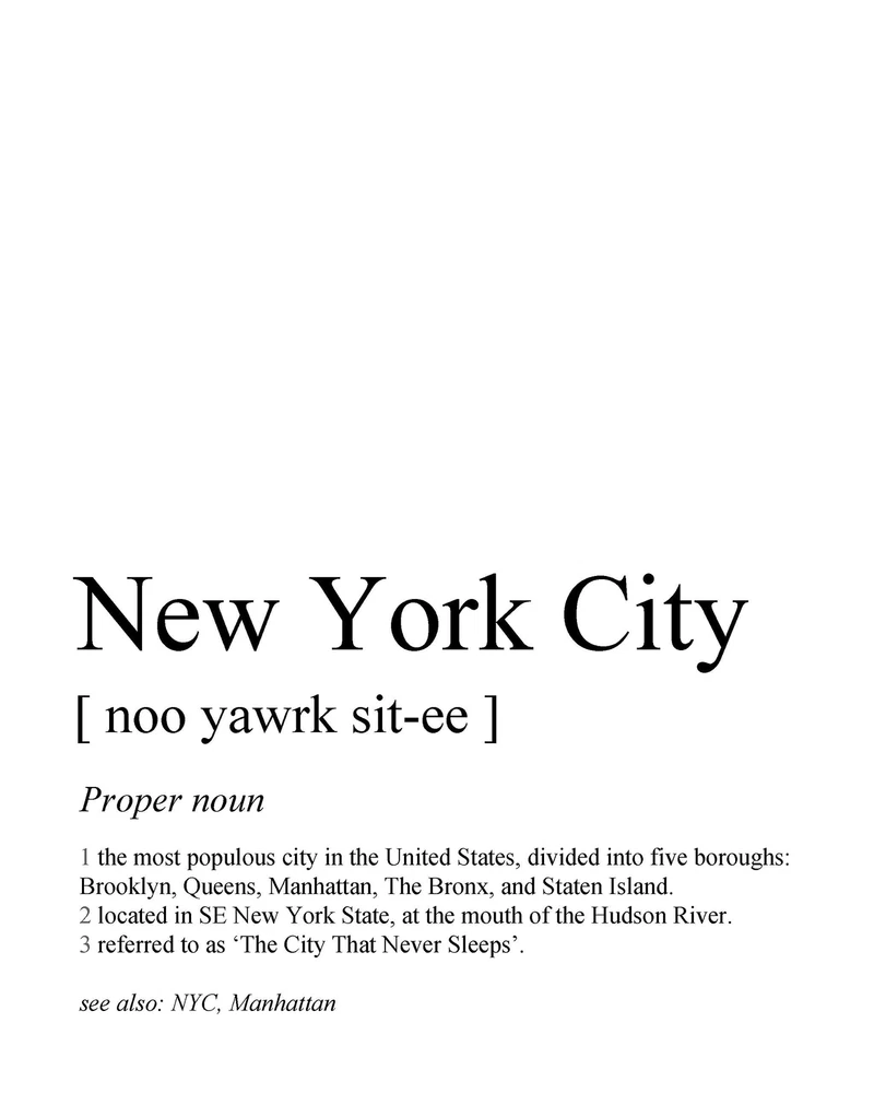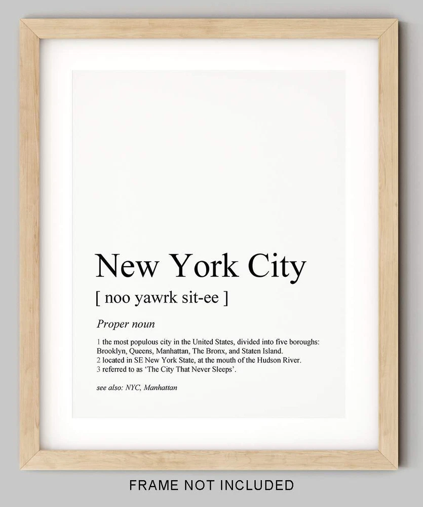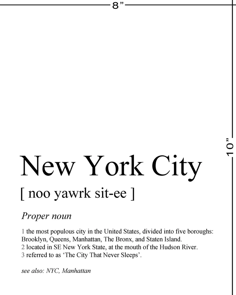 This wall print features a replication of a dictionary definition of the city of New York! PERFECT GIFT! This wall print is a perfect gift for mom's, dad's, men, women, friends, sister, brother or for yourself! It is great as a Mother's Day gift, Father's Day gift, anniversary gift, birthday gift, or at any time of year! READY TO FRAME - Frames to fit these 8x10 inch print is easy to buy here on or at any department or craft . Choose the frame color, width & mat sizes that work with your decor for the perfect look in your home! QUALITY PRINTS, MADE TO LAST - Our designs are printed on Crystal Archive Type II photographic paper (light sensitive and long-lasting). It has a luster, flat matte finish with a slight, subtle sheen and a minimal texture that brings a nice depth and quality to the artwork. Ready to be framed! PROTECTIVE PACKAGING FOR SAFE SHIPPING Prints are packaged & shipped in a sturdy 'stay-flat’ envelope specially designed to protect photographs and artwork during shipping. However, if a print is damaged during transit (these things happen!), just get in touch and we’ll ship a right away.