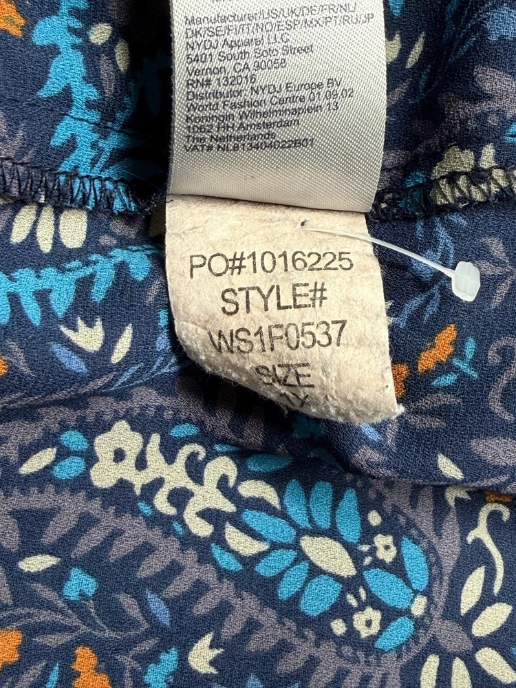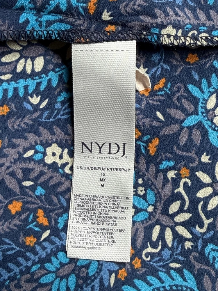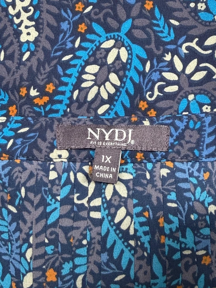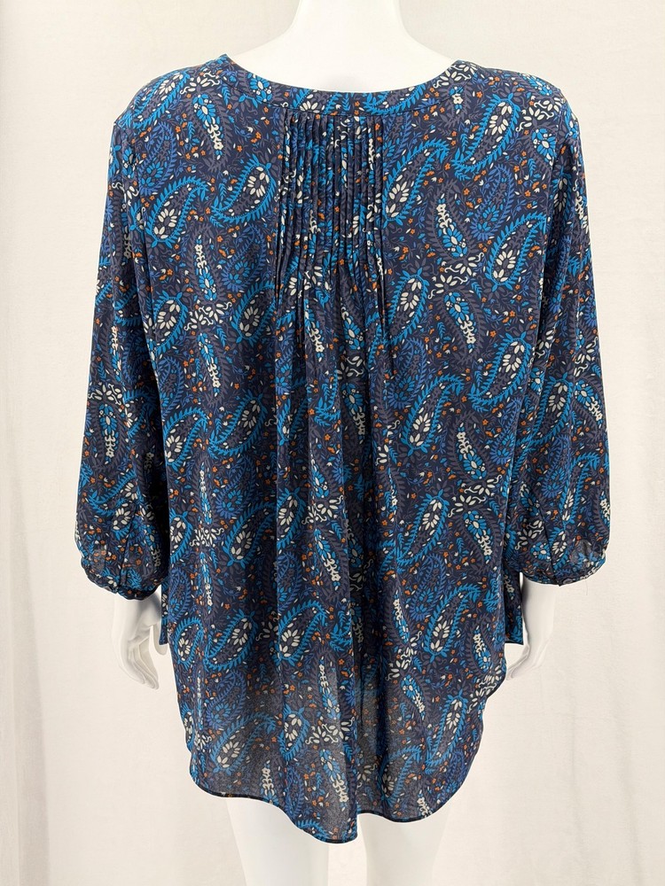 NYDJ Top Womens 1X Navy Paisley Sheer Button Up 3/4 Sleeve Boho V-Neck Office Excellent preowned condition (see photos for more details and measurements) Work Staple Capsule Classic Bohemian Peasant Flowy Travel Lightweight