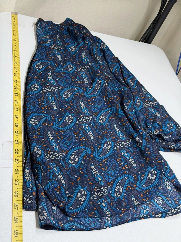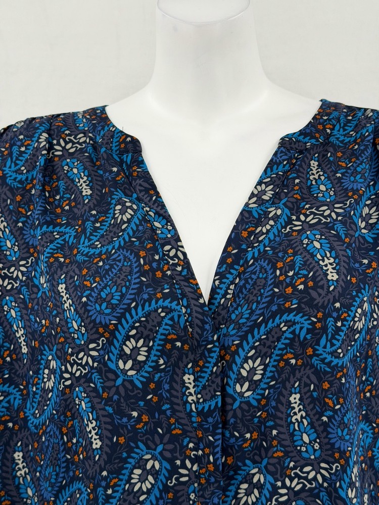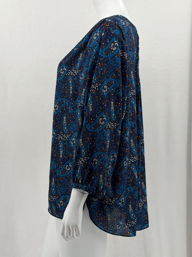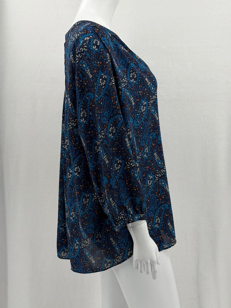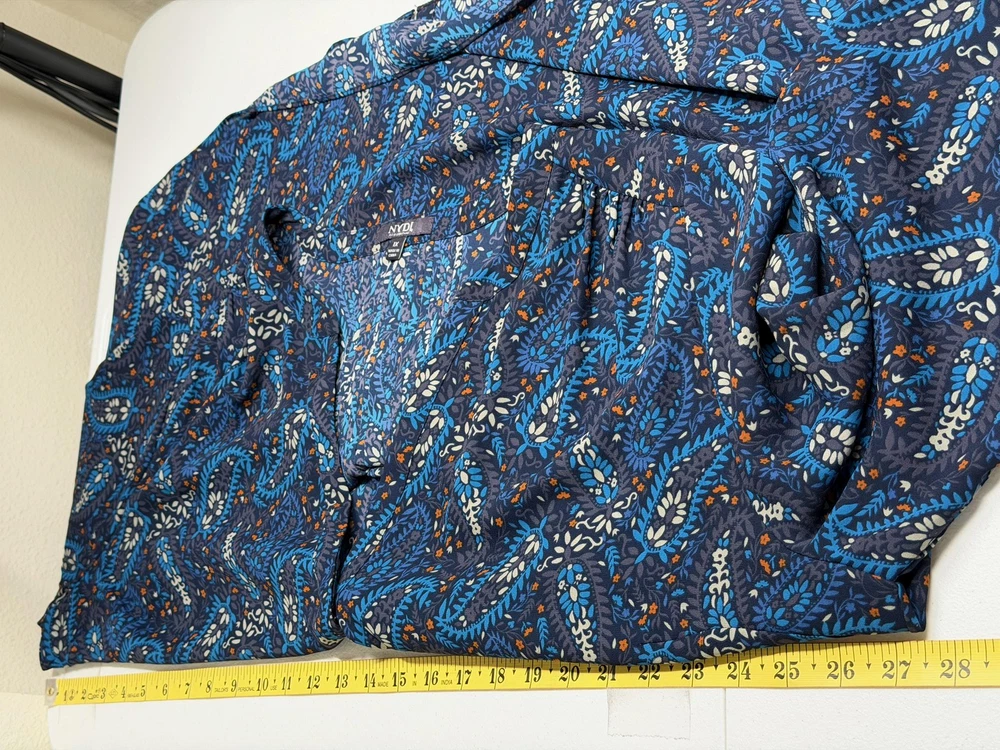 NYDJ Top Womens 1X Navy Paisley Sheer Button Up 3/4 Sleeve Boho V-Neck Office Excellent preowned condition (see photos for more details and measurements) Work Staple Capsule Classic Bohemian Peasant Flowy Travel Lightweight