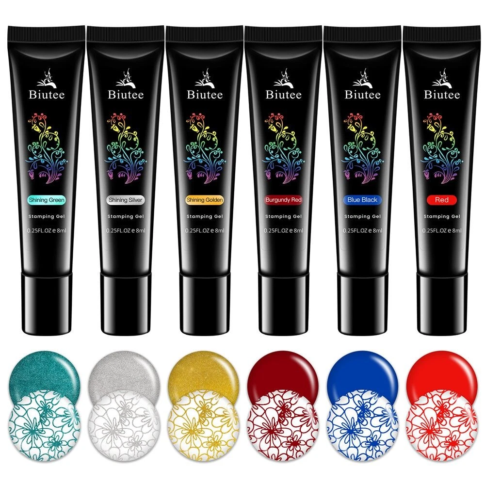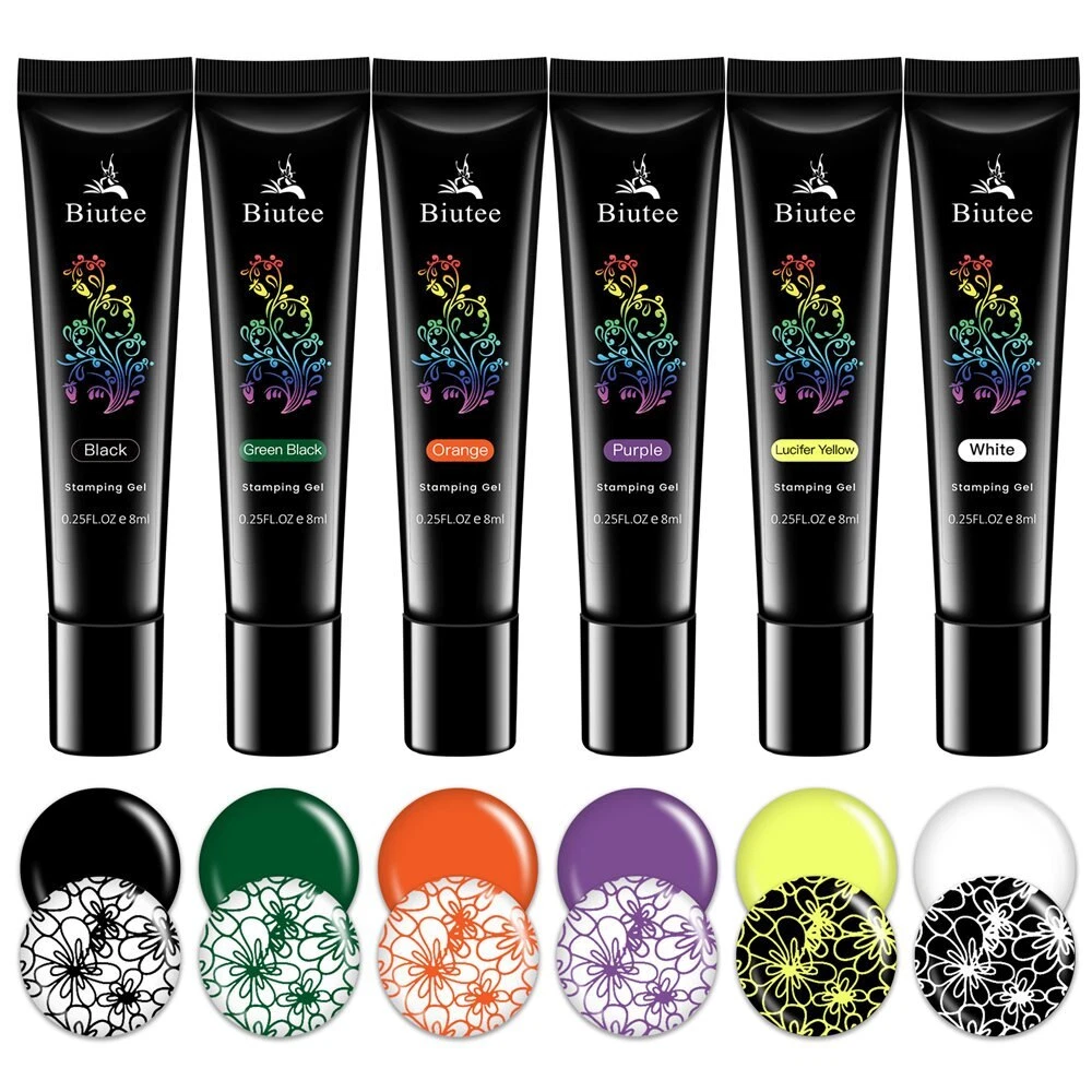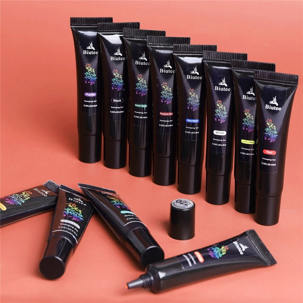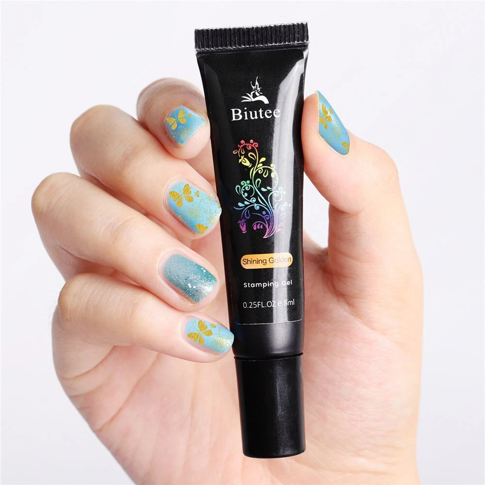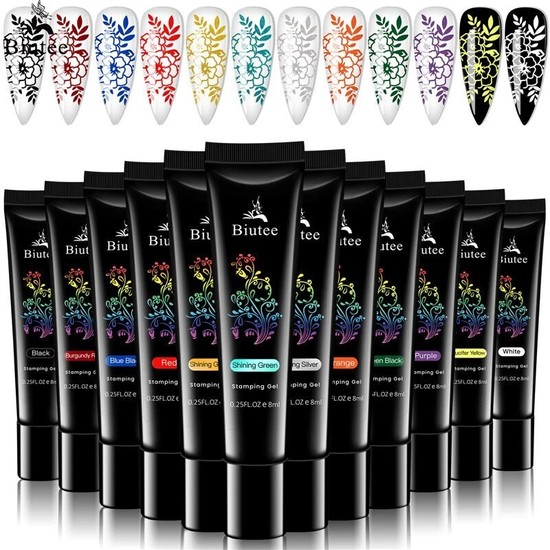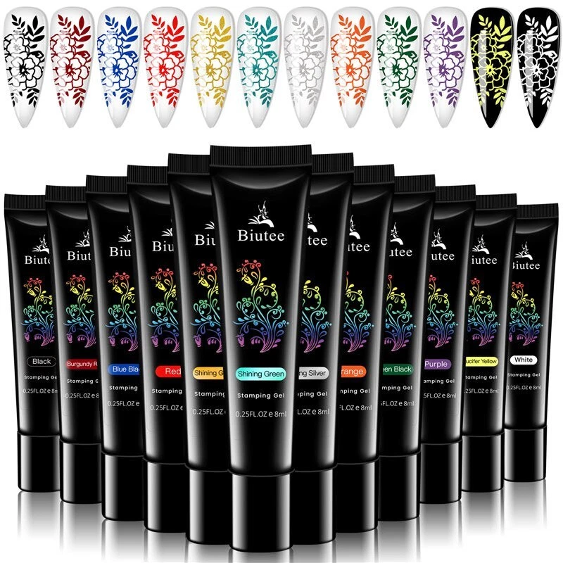 Specification: Brand: Biutee Quantity: 1 Set(12 Colors) Capacity: Approx. 8ml/1pc Package Contents: 12pcs 8ml Biutee Stamping Gel Feature: Special nail gel for nail art stamping and printing colors. Superior Quality and brand new merchandise. Has no requirement for operation speed, more suitable for beginner. Need to cure by UV lamp. How to use: Step 1. Apply base color on the nail with base coat and cure. Step 2. Apply Nail Latex. Step 3. Apply Stamping gel on the stamping plates. Step 4. Use a transparent scratch gel. Step 5. Press the stamper and pick up the pattern. Step 6. Transfer on nails and cure under UV lamp for 2 minutes or under LED lamp for 30-60 seconds. Step 7. Peel of the nail latex. Step 8. Apply top coat and cure under UV lamp for 2 minutes or under LED lamp for 30-60 seconds. Finished.