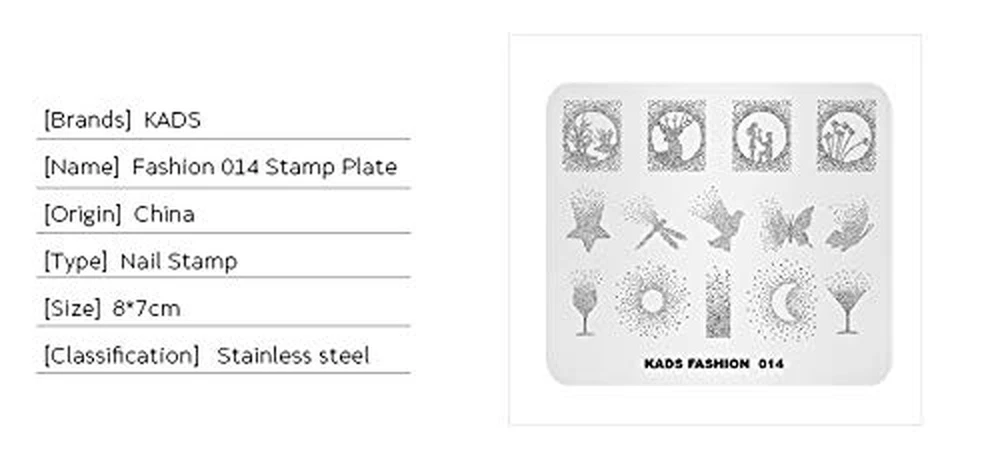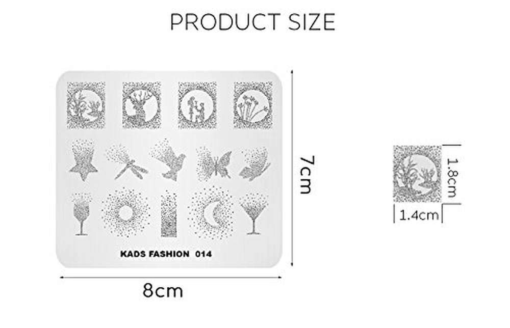 Store New Arrivals Add to Favorite View Feedback Contact Nail Stamping Plate Fashion Nail Art Stamp Template DIY Image Template Manicure Stamping Plate Stencil Tools(Fashion 014) Description Item model number G00029-FA Style Fashion Product Dimensions 3.15"L x 2.76"W Material stainless steal Pattern Name FASHION 014 Is Discontinued By Manufacturer No Manufacturer Co., Ltd The plate is made of high quality stainless steal which ensure the high quality of the product. Stamping plates designed by KADS designer ensures your unique experience of nail art. Deep and precise carving give you better stamping effect than normal stamping plates. Using KADS stamping plate will makes your nail more attractive. Includes 4 unique nail Art stamping plates with 15 to 25 designs on each plate. Features: 100% new retail size:7*8 cm Package Contents : 1pc KADS Nail Art Stamp Template Instructions: The plate is shielded by a thin transparent protective film, please remove the film before use, so that the nail polish can be transferred by the stamper. How to use : 1. Apply base coat or regular polish on the nail. 2. Apply the nail polish to desired image within a plate. (Recommended: Use the Solid Color Nail Polish, so that the texture will be thicker than other nail polish) 3. Make a scraper leaned over 45 degrees and scrape excessive polish off quickly and strongly from inside to outside. 4. Immediately press the stamper with a gentle rolling motion to pick up the design. The image is transferred on the stamp. 5. Stamp the image on your nail with a gentle rolling motion. The image is transferred on your nail. 6. Repeat the above steps for all of your nails. 7. After stamping nail art, apply top coat for lasting wear. ABOUT US We offer the best prices around on high quality products. Our E-store includes media such as books, movies, music and games while offering electronics, toys, sporting apparel, clothing, tools, general home, garden items and more. SHIPPING We are always working hard to ensure your package arrives as soon as possible. Please understand that some factors like weather, high postal traffic, and the performance of shipping companies are outside of our control. We offer free shipping to the lower 48 states and ship within 2 business days of payment, usually sooner. We do not accept P.O. Boxes. Please provide a physical address. For shipping outside of the continental USA, we only use eBay's Global Shipping Program.The item is shipped to KY and then sent to the rest of the world. International customers are responsible for all duties and taxes. Continue to check out in order to calculate costs for shipping the item to your country. Messages regarding eBay's Global Shipping Program MUST be directed at eBay EXCLUSIVELY. RETURNS We offer a 30-Day Return Policy on items which you are not completely satisfied with. You have the option for a full-refund or an exchange of the item. No returns are available on items shipped outside of the USA. PAYMENT We accept PayPal. CONTACT US This page content is yet to come Please ad us to your favorite seller and visit again later Thank You CUSTOMER SATISFACTION We try our very best to make sure every customer is completely satisfied. If there's a problem, message us! We're happy to help. WE ACCEPT Copyright © 2021 AutoDS. | All Rights Reserved
