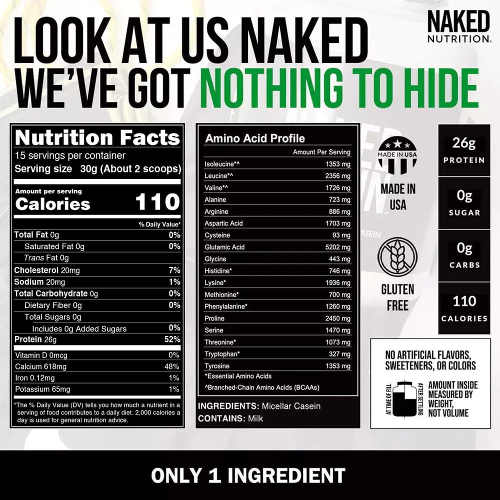 Naked Casein - 1Lb Micellar Protein - Bulk, 1 Pound (Pack of 1) Product Details Is Discontinued By Manufacturer : No Product Dimensions : 4 x 4 x 8 inches; 1 Pounds Manufacturer : NAKED nutrition Brand: Naked Nutrition Flavor: Unflavored Servings per Container: 15 Item Weight: 1 Pounds Material Type Free: Gluten Free, Soy Free, Non-GMO ONLY ONE INGREDIENT: 100% Micellar Casein Protein Powder with no rBGH and no rBST. No additives mean your casein shakes, smoothies and recipes will provide clean muscle gains and maximum recovery. US FARMS ONLY: Our Casein is brought to you only from US farms to ensure that our protein powder is packed full of essential amino acids, clean protein and BCAAs. COLD PROCESSED: Naked Casein is cold processed, which means there is no contamination from chemical detergents (no acid or bleach) or synthetic additives. UNMATCHED NUTRITION: 26g of Protein, 2g of Sugar, 0g of Carbs, 110 Calories, and 5.9g of BCAAs (branched-chain amino acids) per serving. PURE CASEIN PROTEIN: No additives mean your pre and post workout casein protein shakes, smoothies and recipes provide clean muscle gains and maximum recovery.