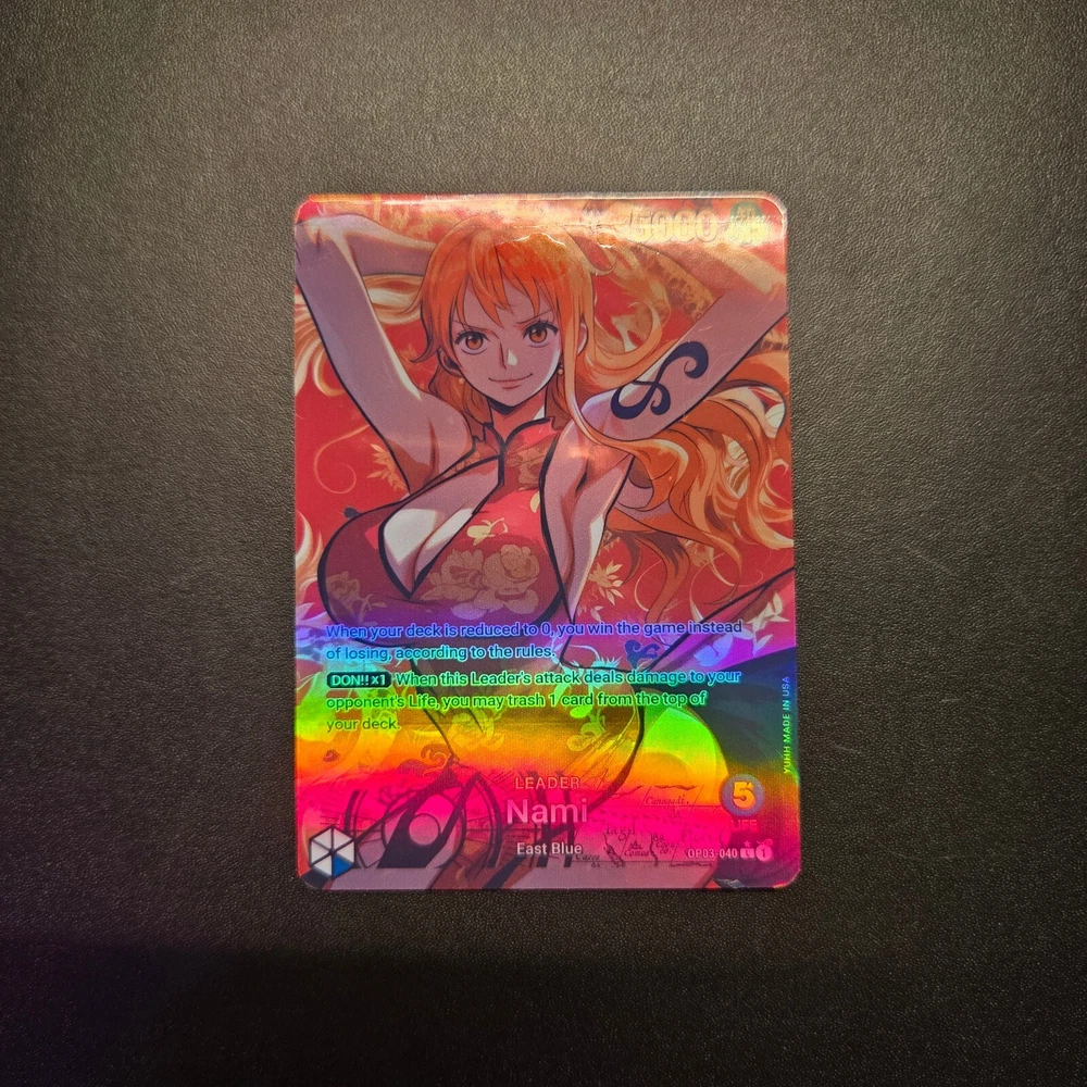Holographic Foil Nami Leader Card One Piece Card Game Proxies Set: OP03-040 Variant: X Card size: Standard (2.5 x 3.5 inches) Materials: Glossy Vinyl, One Piece Playing Card --------------------------------------------------------------------------- Are you a cultured and distinguished gentleman that enjoys waifus? If so, then you are in the right place! Each card is handmade, and made to order. I have experimented and choose the best materials to replicate the quality of the original card. Each card is laminated with protective vinyl (waterproof), and applied on an official One Piece Card Game leader card. I inspected every card before shipping to ensure each card is up to standard. I love each card I create and I hope you do too 💖. View my store for see all the proxies! Please contact me for any questions or concerns. Thank you! --------------------------------------------------------------------------- This is a fan-made custom card that is a parody of the actual card game. AI and Photoshop was used in the help of this art.