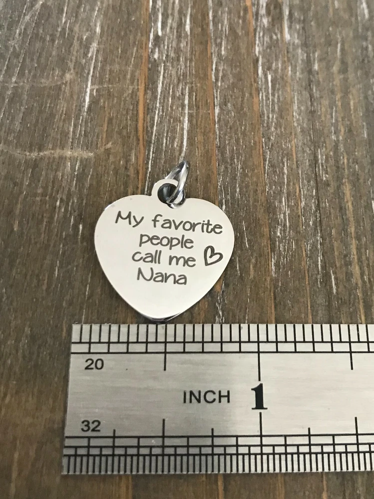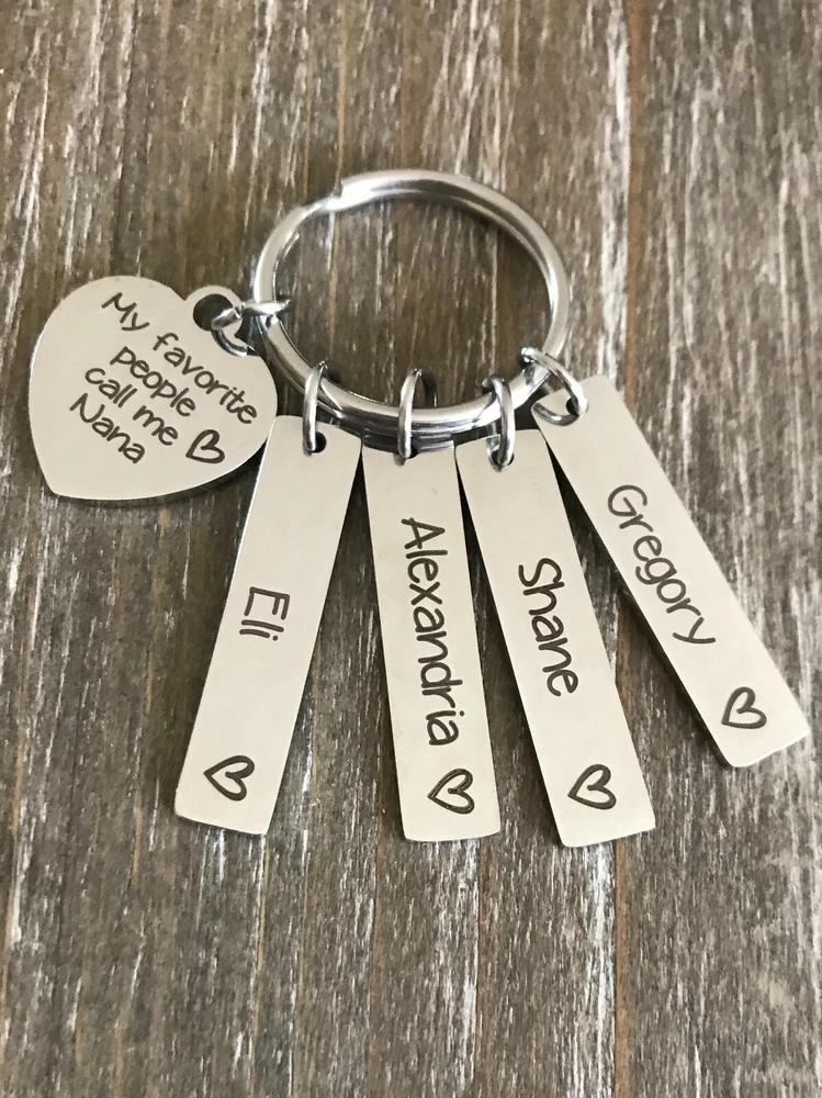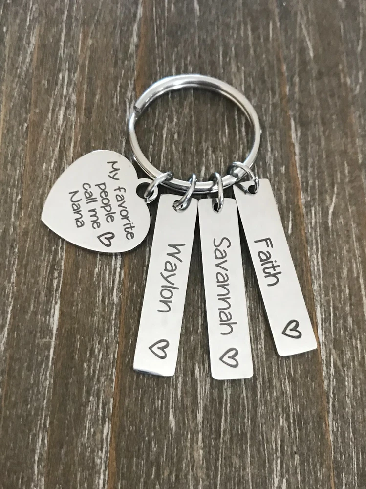 Listing is for Completed custom Name Keychain, Keychain includes custom Heart charm with your chose of wording ( up to 34 characters ) and your choice of name bars ( up to 11 characters each, capital letters are 2 characters each ) Each bar will have a heart engraved at end. Key ring is aprrox.1 inch Stainless Steel Custom bar charms are 1 1/4" Stainless Steel Heart charm is 3/4"Stainless Steel Keychain will come in Gift box ready to Gift :) *IMPORTANT* Please be sure to include Names ( up to 11 characters each ) in notes to seller during check out or in messages :) Please be advise capital letters count as 2 characters each. If requests for heart are not left this will come as My favorite people call me Nana Stainless Steel doesn't need polished, will not tarnish and doesn't stain the surrounding skin. It's properties are hypoallergenic for those with metal allergies.