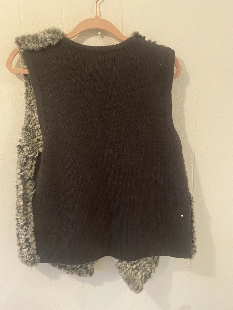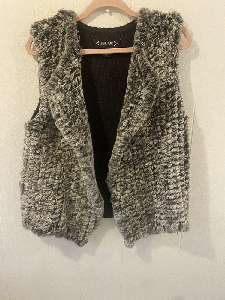 Nanette Lepore Vest Womens M Faux Fur Front Knit Back Hook Eye Closure Grays *left side piece of fur sticks out a little more, hard to tell