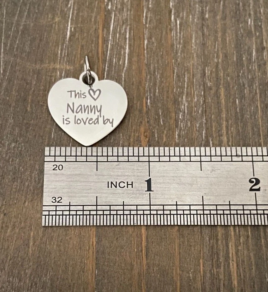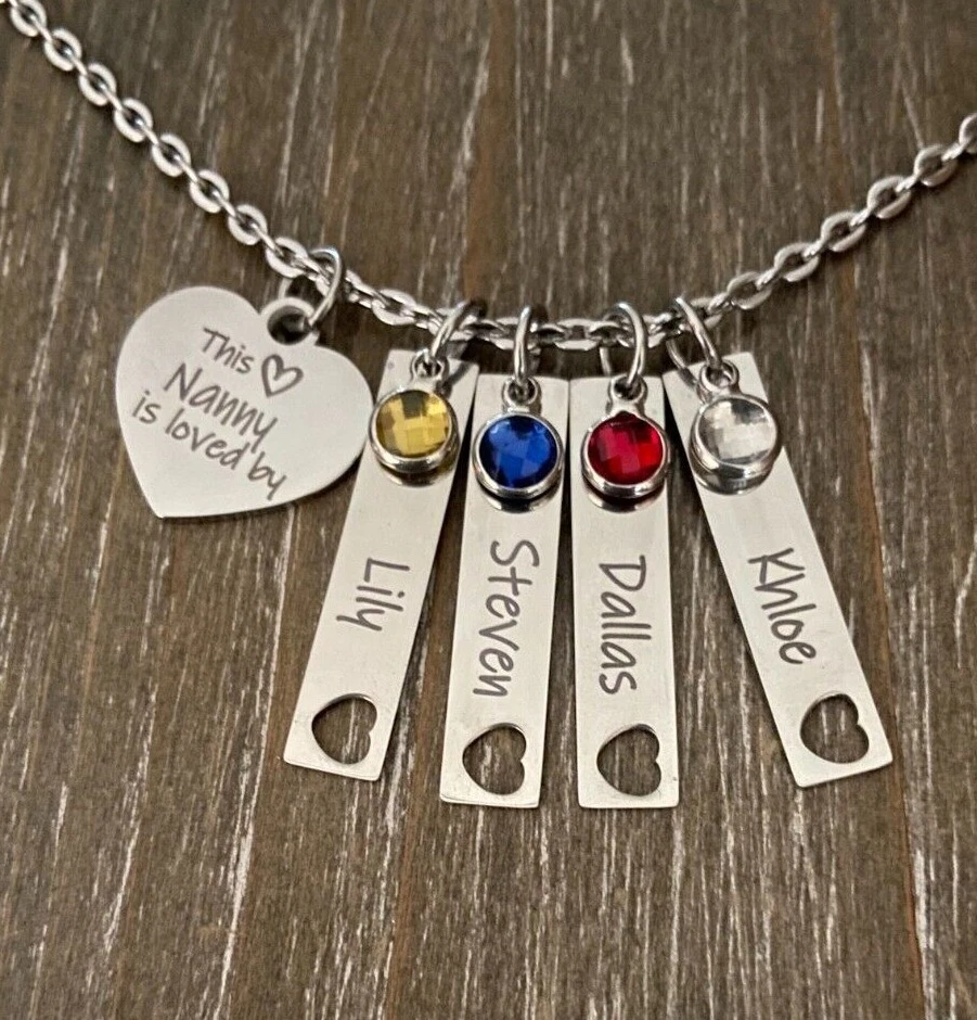 Listing is for Completed custom Name Necklace Necklace includes Heart charm with your choice of engraving ( up to 24 characters ) and custom cutout heart Bar Name charms with your choice of Names ( up to 10 characters, capital letters count as 2 spaces ) and birthstones. Chain is 18" Stainless Steel. I do also have 24" available upon request. Custom bar charms are 1 1/4" Stainless Steel Heart charm is 3/4 Stainless Steel Necklace will come in Gift box ready to Gift :) *IMPORTANT* Please be sure to include Names and Birth months in notes to seller during check out or in messages :) If requests not left for heart this will come as This Nanny is loved by :) Stainless Steel doesn't need polished, will not tarnish and doesn't stain the surrounding skin. It's properties are hypoallergenic for those with metal allergies. Please be sure to check messages after purchase in case of any questions I may have so your order is not slowed :)