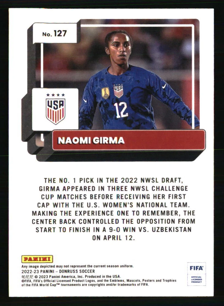 Year Manufactured: 2022 Set: 2022-23 Donruss Player|Athlete: Naomi Girma Card Number: 127 Sport: SOCCER Insert Set: Orange Season: 2022 Graded: No Team: USA Type: Sports Trading Card Autographed: No Manufacturer: Donruss