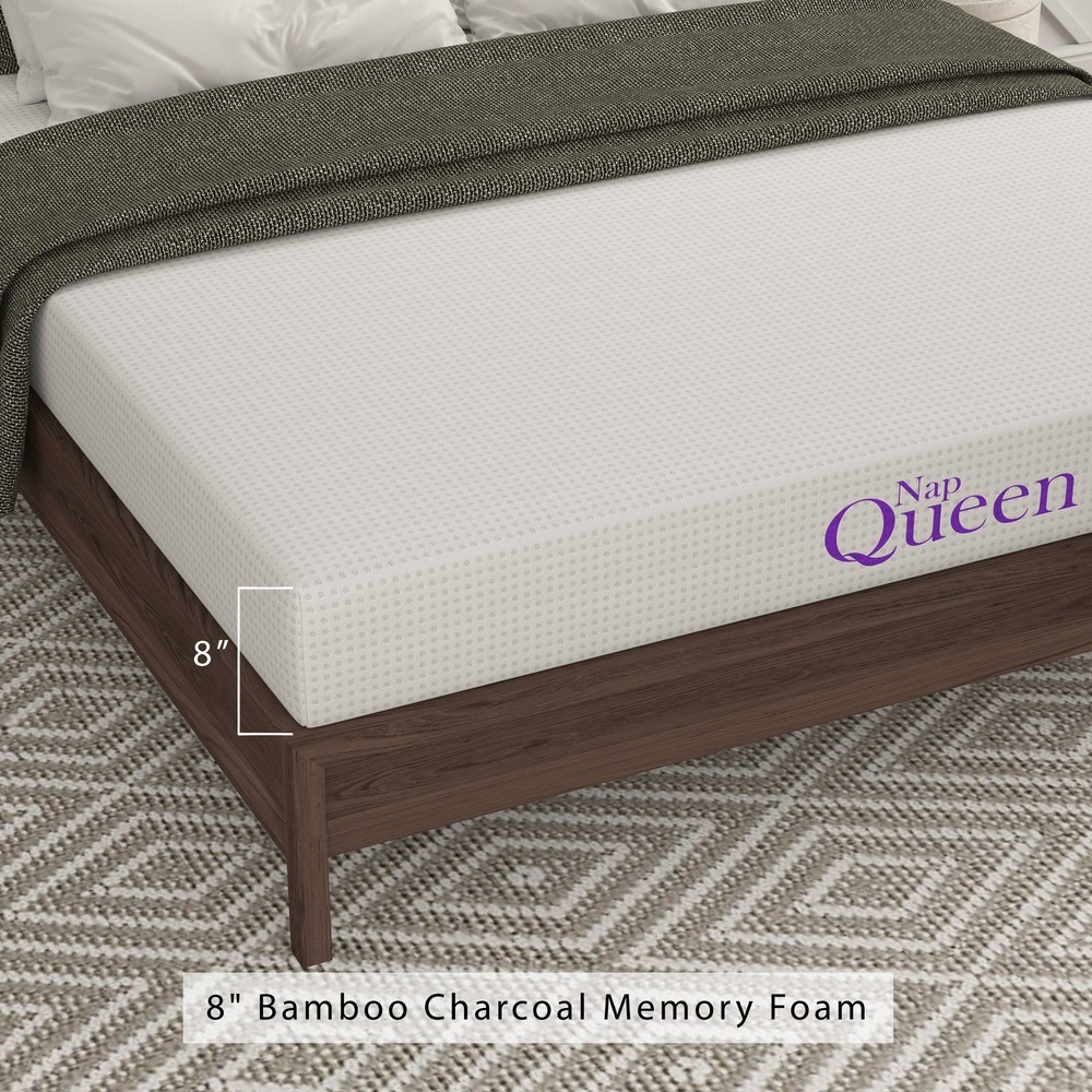 Comfort in Spades Its hard to go forth and conquer when your bed conspires against you. Show your bed whos in charge by replacing it with a medium firm foam mattress from NapQueen. Never again shall it darken your days with exhaustion! Choose from 15 combinations of size and thickness to optimize your sleep space and firmness. Your bed will arrive compressed into a convenient roll that will expand to its original shape in 24-48 hours. This One Is Just Right Dont worry about the choice between a soft mattress and a firm mattress. Get a layered hybrid with the benefits of both! Your memory foam bed transitions from a super-soft top to a high-density, firm bottom. Enjoy a soft, muscle-friendly surface with skeleton-friendly support. Feel like youre sleeping on a cloud without sinking into Free Shipping Over $49.99* Details NapQueen 8" Bamboo Charcoal Memory Foam Mattress Product Description: Comfort in Spades Its hard to go forth and conquer when your bed conspires against you. Show your bed whos in charge by replacing it with a medium firm foam mattress from NapQueen. Never again shall it darken your days with exhaustion! Choose from 15 combinations of size and thickness to optimize your sleep space and firmness. Your bed will arrive compressed into a convenient roll that will expand to its original shape in 24-48 hours. This One Is Just Right Dont worry about the choice between a soft mattress and a firm mattress. Get a layered hybrid with the benefits of both! Your memory foam bed transitions from a super-soft top to a high-density, firm bottom. Enjoy a soft, muscle-friendly surface with skeleton-friendly support. Feel like youre sleeping on a cloud without sinking into it! Protecting the People Upgrade your sleep with a CertiPUR-US certified mattress. Know that when you zonk out face down on your bed, you wont be breathing in formaldehyde, heavy metals, phthalates, or other harmful chemicals. Your mattress for twin beds foam was rigorously inspected for chemical safety, foam performance, and product durability. Join the NapQueen Court Find out why so many well-rested folks have sworn their allegiance to the NapQueen! Let our twin size mattresses straighten out your spine, pull heat away from your body, and leave you feeling rejuvenated and ready for the next day. Send your outdated, traitorous bedding into exile, and start Napping like a Queen! Sleep like you own the place. Take the Throne Regain precious hours of slumber and leave the aches and pains of bad sleep behind. Your twin bed mattress from NapQueen is a modern bed engineered for ergonomics and breezy airflow. Lie in Luxury Wake up feeling like royalty. Snuggle into a silky-soft jacquard top and let your spine be perfectly cradled. Your medium plush mattress is great for side and stomach sleepers. Fortified Comfort Feel the sleep-enhancing benefits of 3 layers of foam, each optimized for comfort. Your cooling memory foam mattress is infused with charcoal to regulate moisture, heat, and odor. Regal Cleanliness Sleep on a super comfortable mattress with no VOCs, formaldehyde, or heavy metals. Your eco-friendly mattress is CertiPUR-US certified for materials, performance, and durability. We Bow to You Call on the NapQueen when you want a modern twin size bed in a box, delivered in a convenient compressed roll. Your bed is backed by our commitment to your well-rested satisfaction.