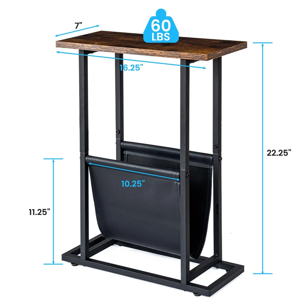 【Multiple Uses】Compact size, space-saving design crafted with a sturdy frame and durable P2 Particle board for long lasting,the small end table can be used as side table, end tables, snack tables, couch tables, drink tables, nightstands or bedside tables for living room, bedroom or home office. 【Improved Durability & Reliability】Constructed of heavy-duty metal frame and durable manufactured wood, this industrial narrow side table has long service life. The retro finish is scratch-resistant and wear-resistant, while can hold up to 60 lb. 【Side Table with Storage】Overall Dimension of this sofa side table is 16.25"W x 7"D x 22.25"H. This couch table with PU bag provides more space for the laptop, magazines, books, etc. 【Perfect for Any Small Space】 With 22.25 inch tall, this narrow sofa side table is suitable for any small space in your home. 4 Adjustable Feet add the extra stability to this snack table and prevent your floor from scratches 【Easy to Assemble】The side table comes with complete accessories and manual, you can assemble in 10 minutes. If you have any questions please feel free to contact us, we will reply you within 24H.