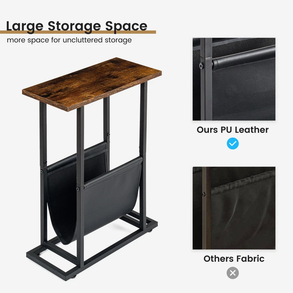 Narrow Side Table with PU Leather Magazine Holder Rustic Slim Little Thin Tab...