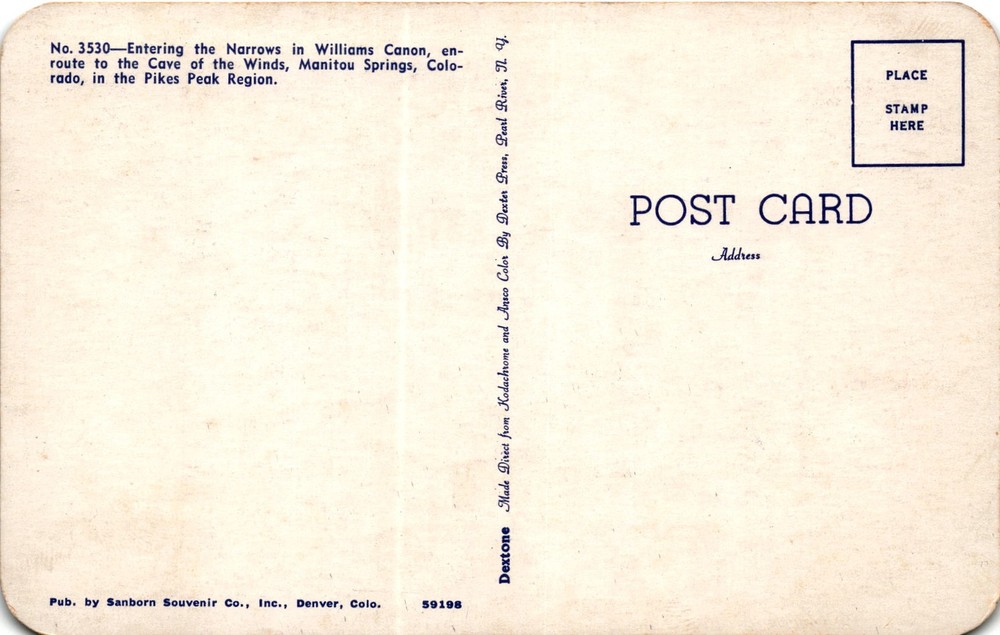 MAKE AN OFFER. THE MORE YOU BUY THE BETTER DEAL I WILL ACCEPT The postcard features an image of the Narrows in Williams Canon, located in Manitou Springs, Colorado, in the Pikes Peak Region. The Narrows is a narrow passage or gorge formed by the erosion of rock, creating a scenic and picturesque natural feature. The area is a popular destination for tourists and outdoor enthusiasts due to its stunning beauty and unique geological formations.