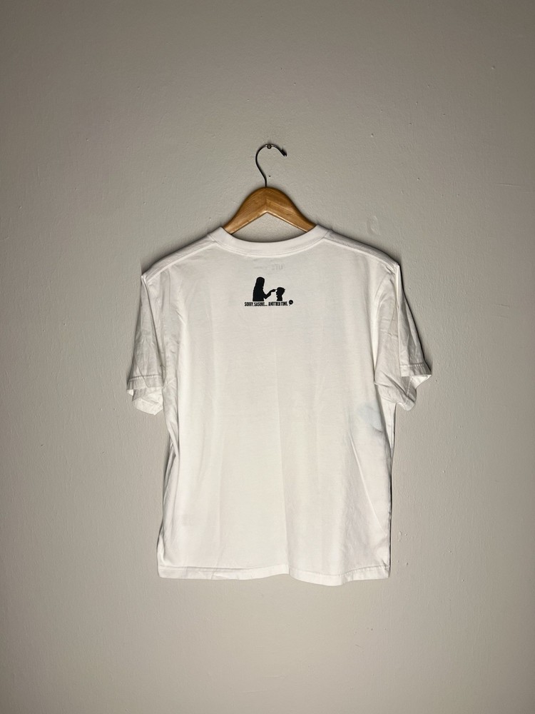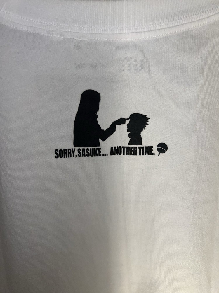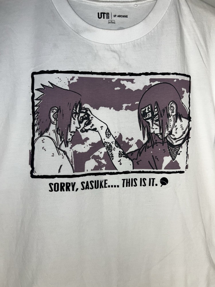 White UT Archive Naruto Shippuden graphic tee featuring the iconic Itachi and Sasuke confrontation with the quote “Sorry, Sasuke… This is it.” Clean anime panel artwork on the front with a subtle back hit, printed on a Uniqlo UT Archive blank for a modern vintage-inspired fit. Strong crossover appeal for anime collectors, streetwear fans, and Naruto heads. See photos for details. #naruto #narutoshippuden #anime #graphictee #vintage