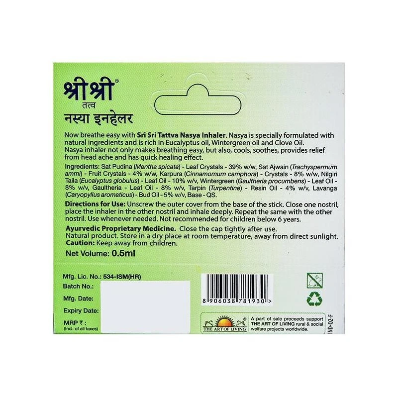 Nasya (Nasya Breathe Easy) - a natural remedy in the form of a nasal inhaler. The herbal composition of nasya contains mint, eucalyptus, clove and wintergreen oils, which facilitate breathing and help relieve nasal congestion. The product has antifungal and antibacterial properties, helps with colds, and also reduces headaches and has a healing, soothing and cooling effect.. basic information: natural product certified by GMP and HACCAP not tested on animals suitable for vegetarians and vegans makes breathing easier helps relieve nasal congestion has antifungal and antibacterial properties helps with colds reduces headache has a healing, soothing and cooling effect is not a drug Indications for use: easier breathing nasal congestion fungi bacteria cold voltage headache for healing Contraindications: individual intolerance to individual components during pregnancy and lactation, you should consult a doctor Active Ingredients: Spearmint (Sat Pudina) - promotes free breathing, acting on the upper respiratory tract, has a relaxing effect. Eucalyptus globulus oil (Nilgiri Taila) - helps with respiratory diseases, strengthens the body, relieves swelling. camphor cinnamon (Karpura) - freshens breath, is an antiseptic, improves immunity. Wintergreen lying down (Wintergreen) - relieves pain, useful in chronic respiratory diseases. Instructions for use: Close one nostril, place the inhaler in the other nostril and inhale deeply. Repeat the same with the other nostril. Close lid tightly after use. Composition: Spearmint (Sat Pudina) – 39% w/w, Ajgon (Sat Ajwain) – 4% w/w, camphor cinnamon (Karpura) – 8% w/w, Eucalyptus globulus oil (Nilgiri Taila) – 10% w/v, Wintergreen (Wintergreen) – 8% w/v, Wintergreen (Gaultheria) – 8% w/v, Turpentine oil (Tarpin) – 4% w/v, Clove (Lavanga) – 5% w/v, Product base (Base) - required amount (Q.S.). Storage conditions: Store in a dry place at room temperature and away from sunlight. Shelf life: 3 years. Denial of responsibility: tries to provide only up-to-date information about products, but the packaging design may differ from that presented on the site. Before using the drug, read the instructions for use attached to it or consult a specialist. Manufacture country: India