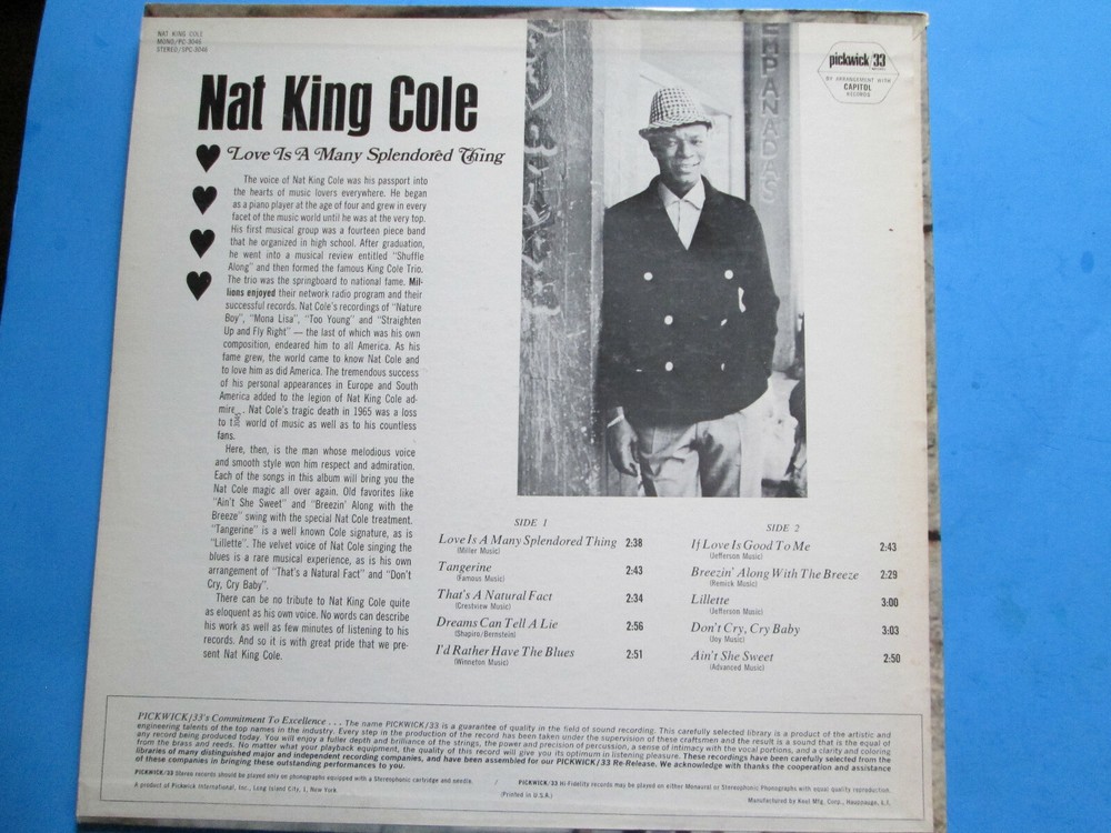 Nat King Cole Love Is A Many Splendored Thing Capitol SPC 3046 lp record album cover is missing pieces, album has scratches (it has a tic when played but did not skip) Condition: all records that I have listed will be from local estates and are used. They are not in mint condition. Each may have scuffing, light scratches, wear, fading, tears, writing on label and/or sleeve. No sleeve is included with 45's or 78's unless seen in photos of the listing you are currently viewing. LP's will have sleeves unless otherwise noted. Covers may have scuffing, fading, tears, and other issues. Any major flaws will be noted above. _________________________________________________________ Shipping is to United States or global shipping center (foreign orders) only. Sales to foreign countries: you are responsible for all taxes, duties and other charges that your country may require, as well as shipping costs from the U.S. shipping center to your address. “International Buyers – Please Note eBay new shipping policy" • Import duties, taxes and charges are not included in the item price or shipping charges. These charges are the buyer’s responsibility. • Please check with your country’s customs office to determine what these additional costs will be prior to bidding/buying. Please note that I am not a professional grader. I can only provide information about the items' conditions and not about a certain level of grading. If you need more information on any of my items please contact me. I am glad to give more details.