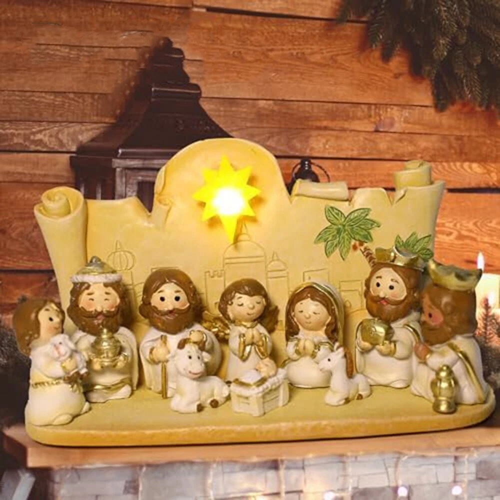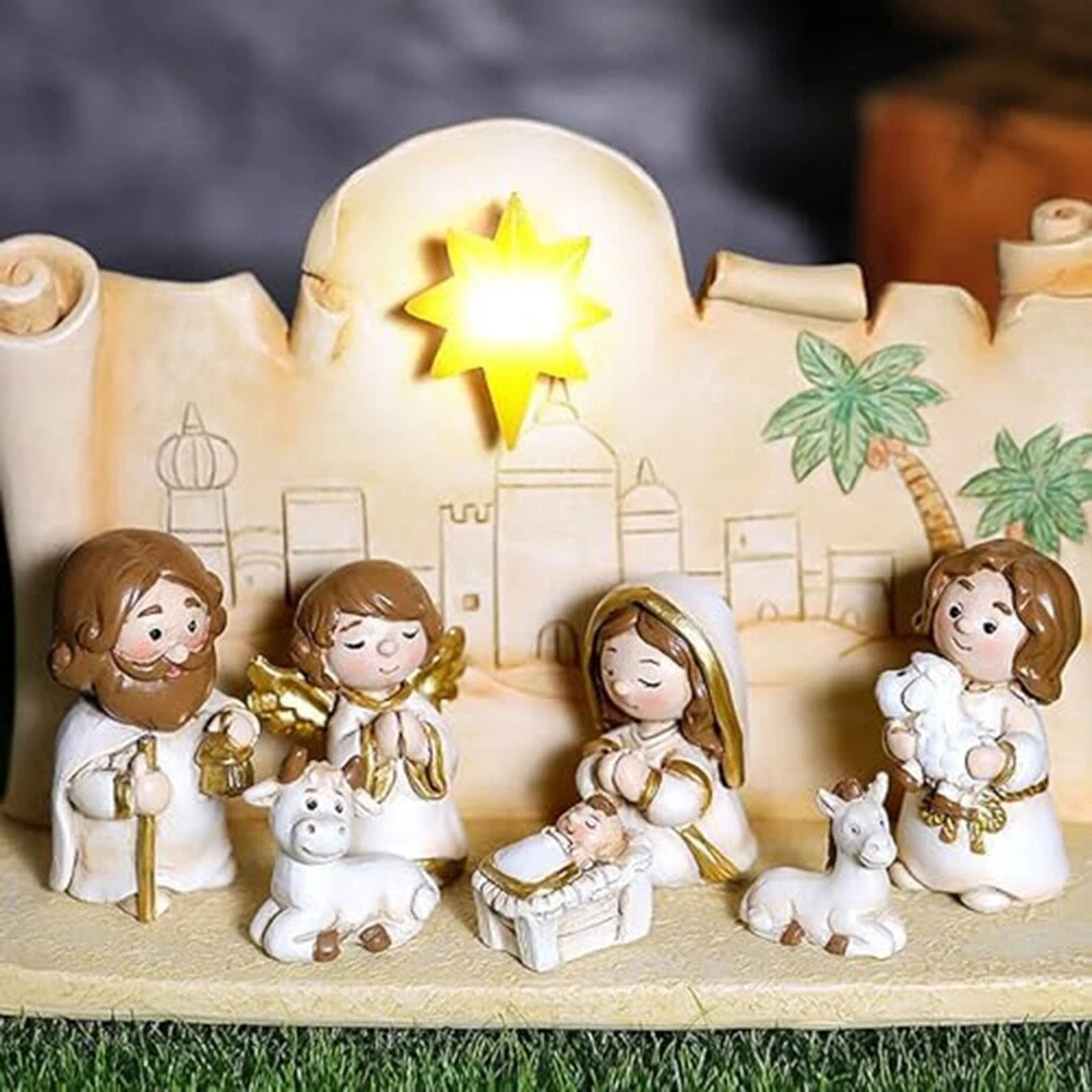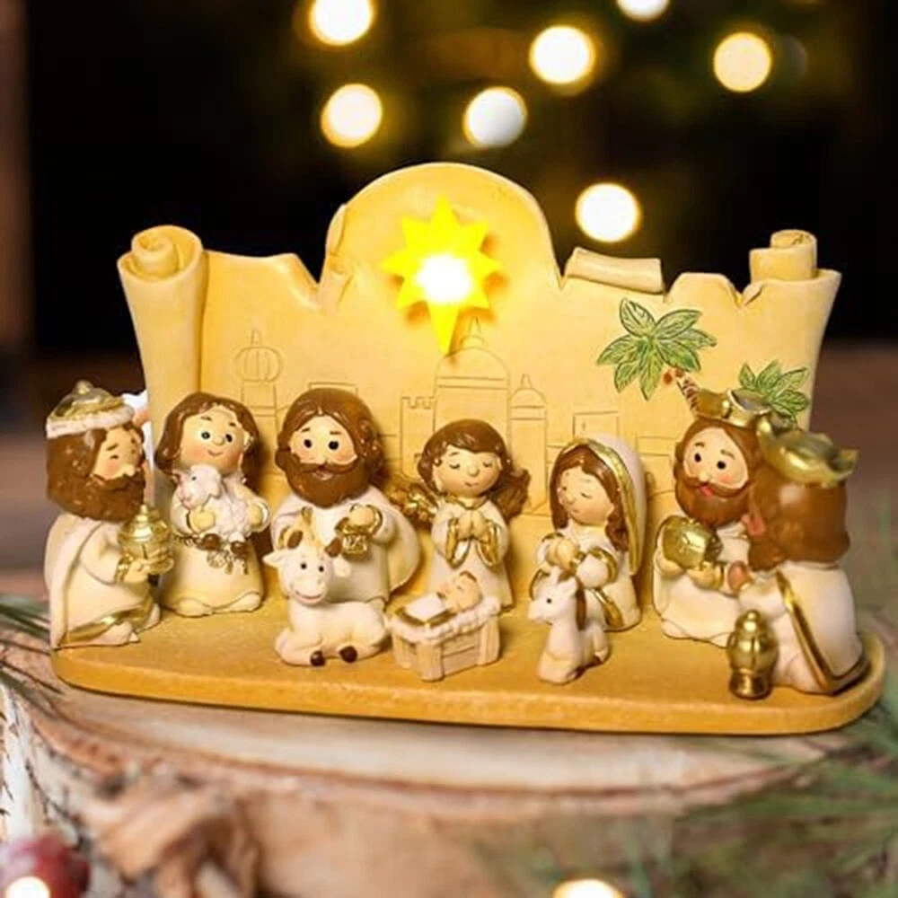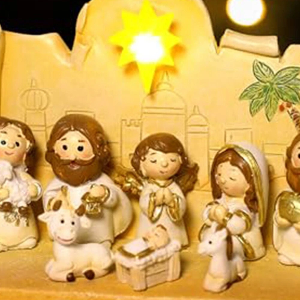Nativity Set Version - 10 Piece Religious Manger Scene Resin Cute Version7333 : This little navity set is absolutely adorable. The cute disign attract children. Many children full in love with it. Craftsmanship: pure handmade works, using high-grade resin in the industry as raw materials, paying attention to details, handmade mini style, very suitable for children to learn the story of Jesus. Applicable places: It can be placed in gardens, lawns, churches, and can be well integrated with the environment. It is a decoration. It can be used as a home altar, art collection or gift, it is a good choice. In terms of design: the design of this product has a childlike atmosphere. The Q-version design allows children to better learn the knowledge of Jesus. Press the angel to listen to music. The size design is for children. Meaning: Ornaments are used to decorate homes and gifts during Christmas to celebrate the birth of . It is presented in a lovely and sophisticated way, allowing people to on the Christian faith during celebrations. Material: Resin colour: As Shown Package Contents: 10 x Decorations 1 x base