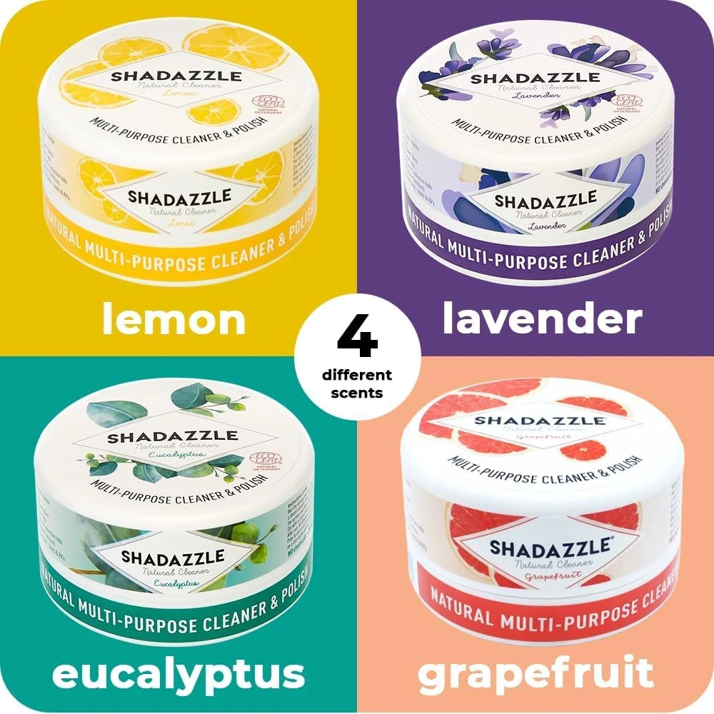 NATURAL ALL PURPOSE CLEANER : Shadazzle is a multi purpose cleaner that works on any washable surface. It is made with natural ingredients only : clay, vegetal oil, vegetal glycerin, lemon fragrance. No harmful chemicals or phosphates ! WHERE TO USE : any kind of metal, ceramics, porcelain, marble, wood... Very effective on stainless steel, silverware, jewelry, glass shower doors, glass stove tops, or even car wheels. CLEAN & POLISHES in just one step ! Shadazzle will do wonders on the surface you clean, but will definitely not scratch it or leave any streak. HOW TO USE : Wet the included sponge, rub it on the product and make it foam. Use the foam to clean everything. Wipe it with a clean and dry towel. ECOLOGICAL AND ECONOMICAL : Shadazzle will help you clean the whole house, saving you time, space and a lot of money ! One tub of Shadazzle lasts much longer than any liquid detergent. Product Description Shadazzle is a multi purpose cleaner and polish ! Certified by Ecocert Effective on every washable surface Made from clay and other natural ingredients Available in 4 scents : lemon, eucalyptus, lavender and grapefruit Won the Best Eco Product of 2023 and 2024 Shadazzle All Purpose Cleaner & Polish Clean everything and get rid of stains with Shadazzle: the one-of-a-kind cleaner that will replace your chemical cleaning products. Shadazzle is a multi-purpose cleaner and polish. Made from natural ingredients only . No chemicals, no phosphates. It’s the best way to clean everything while having no impact on the environment Shadazzle is effective on every washable surface: Cleans your kitchen: stainless steel appliances, countertops, inside your fridge, stovetops, pots and pans Keeps your bathroom clean and shiny: ceramics, shower doors, and tiles Don't forget your car and outside your home: tires, PVC patio furniture and more Shadazzle is a multi-purpose cleaner and polish Certified by Ecocert Effective on every washable surface Made from clay and other natural ingredients Available in 4 scents: lemon, eucalyptus, lavender and grapefruit Shadazzle is a multi-purpose cleaner and polish Certified by Ecocert Effective on every washable surface Made from clay and other natural ingredients Available in 4 scents: lemon, eucalyptus, lavender and grapefruit Shadazzle is a multi-purpose cleaner and polish Certified by Ecocert Effective on every washable surface Made from clay and other natural ingredients Available in 4 scents: lemon, eucalyptus, lavender and grapefruit Shadazzle is a multi-purpose cleaner and polish Certified by Ecocert Effective on every washable surface Made from clay and other natural ingredients Available in 4 scents: lemon, eucalyptus, lavender and grapefruit