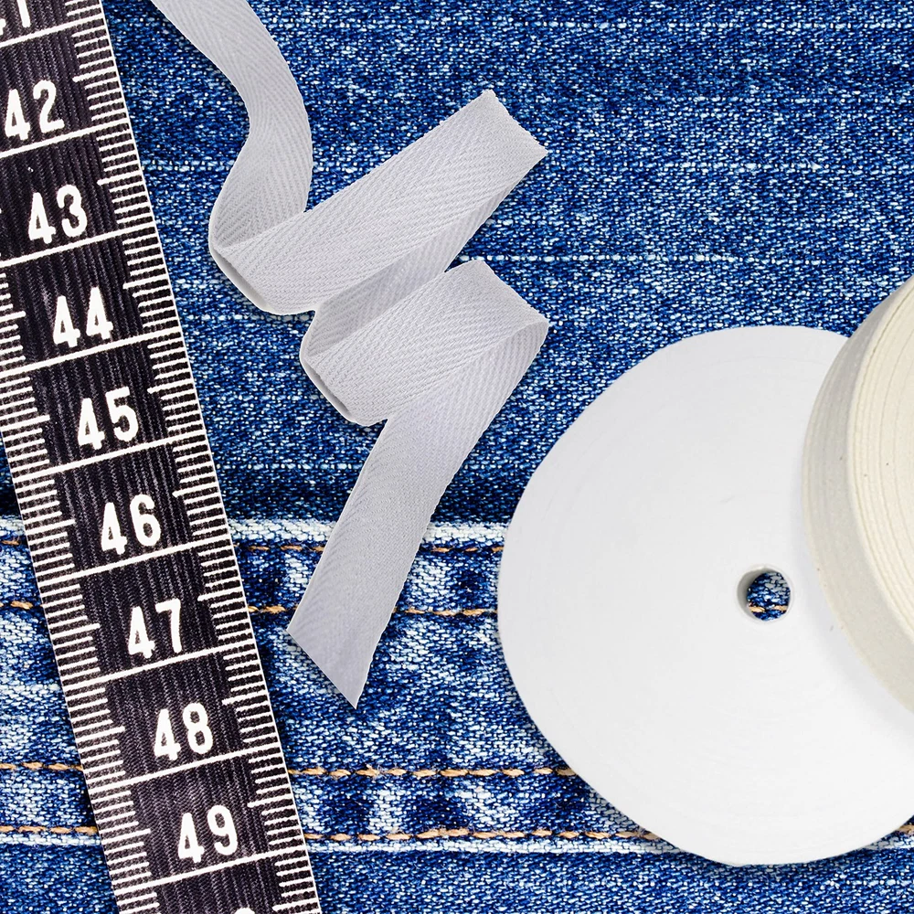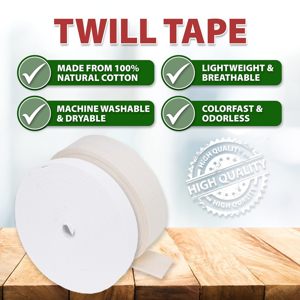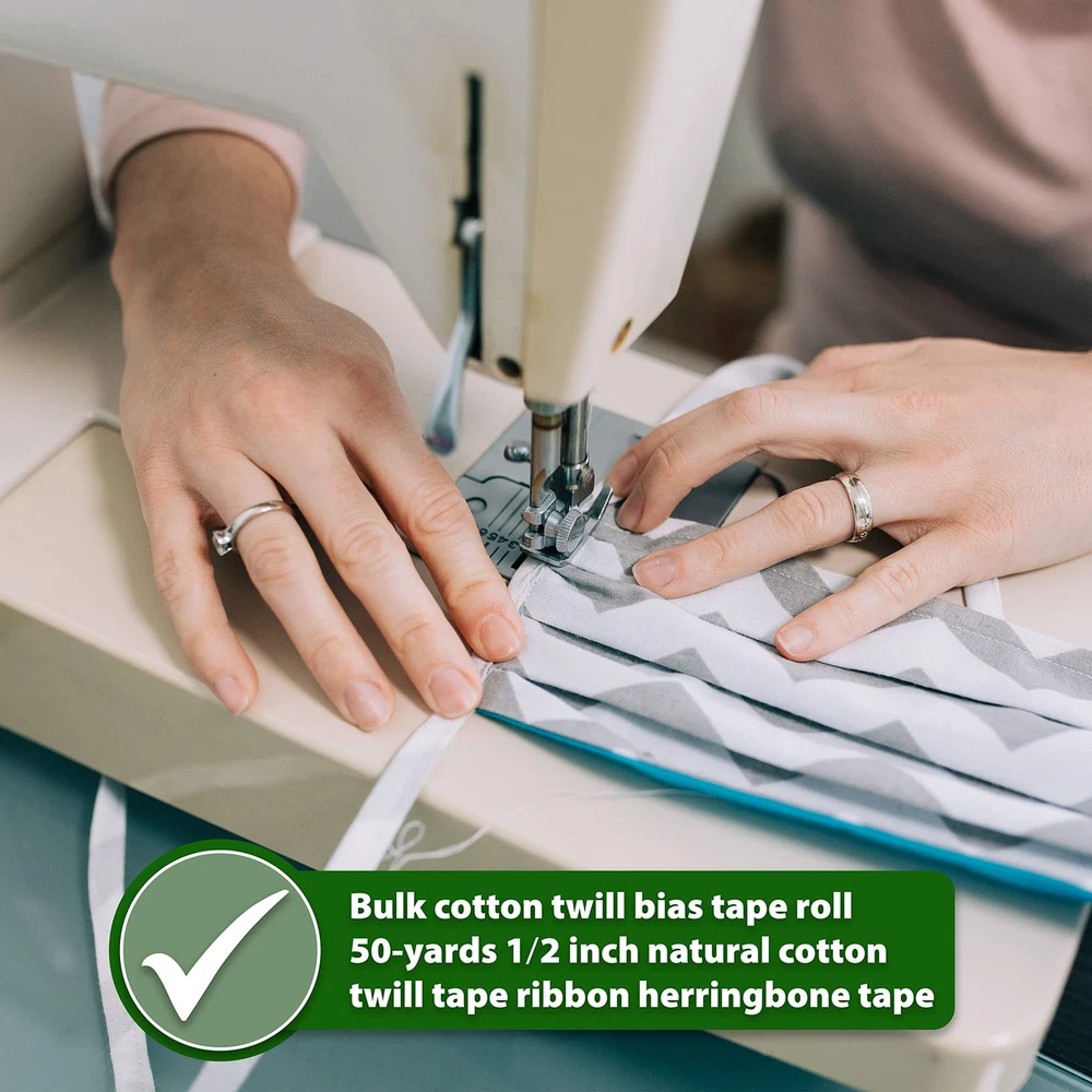 Colorfast Twill Cotton Tape & Cinta de Algodon: Compared to other sewing tapes, our soft cream twill ribbon is preshrunk, odorless, breathable, and machine washable & dryable, serving as heavy duty bias tape, rug binding tape, & seam tape for sewing. 1 1/2 In Cotton Twill Tape Ribbon or Sintas de Tela for Sewing, Hemming, Knitting, Quilting & Dressmaking: The cotton bias tape serves as great drawstrings for sweatpants, waistbands, necklines, hoodie strings, apron straps, & sewing bias tape. Cream Twill Tape Bias Binding Tape Fabric Ribbon: Perfect for ribbon trimming, strapping, & casing, the cotton twill tape 1 1/2 inches is great for creating duvet strings, towel hangers, tying curtains & cables, reinforcing buttonholes, & binding blankets. Herringbone Cotton Tape for DIY Crafting, Scrapbooking, Packaging, & Gift Wrapping: The cotton twill ribbon serves as great book binding ribbon, cotton binding tape for carpet, and woven ribbon for bag handle, banners, tags and labels, & home decor. Bulk 1 1/2 Inches Twill Tape Roll: This 50-yards natural twill tape roll features 1.5 inches wide twill tape. Great for making piping, seams, & finishing raw edge, the continuous natural bias tape is easy to sew and can be cut and trimmed without fraying.