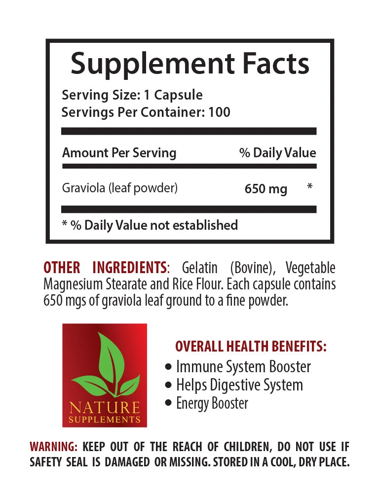 GRAVIOLA & GRAPE SEED EXTRACT COMBO Antioxidant extract Bone strength Flawless skin Emotional well-being Source of carbohydrates Bones formation Vitamin c and Antioxidants Maintain heart muscles Optimal health Made In USA COMBO GRAVIOLA-GRAPE SEED EXTRACT COMBO Grape seed extract is derived from the ground-up seeds of red wine grapes.Grape seed extract has an enormous amount of Antioxidants and flavonoid phytonutrients. These polyphenols include resveratrol and unique oligomeric proanthocyanidin complexes . The main advantage of grape seed extract is that it contains almost 95% of oligomeric proanthocyanidin complexes and that means that it is more than any other Antioxidant extract. Graviola extract effective for the people with a type of poor circulation and high cholesterol. Improving bone strength Calcium that has beneficial effect on bone formation is contained in grape seed extract and also has a positive impact on bone strength for the improvement of bone problems caused by a low level of calcium. Grape seed proanthocyanidins extract plays an important role in the process of bones formation and bone strength at all. By the way, the usage of grape seed extract and vitamins improves bones formation and bones strength. Healthy skin and hair Soursop is a great source of various natural vitamins and Antioxidants that help to prevent our skin from various skin problems, reduce skin issues and ensure flawless skin. Soursop is famous for its powerful properties and helps to reduce wrinkles and prevent your skin from the first signs of aging. As far as soursop is rich in vitamin c and Antioxidants protects skin from the main cause of aging and moisturize the skin. Because of the great source of vitamin C, soursop prevents hair loss, and reduce the risk of premature hair graying. High blood pressure Grape seed extract is extremely rich in Antioxidants and oligomeric proanthocyanidin complexes. Antioxidants in grape seed extract help to reduce high blood pressure and further protect blood vessels. Grape seed extract contains a high percentage of compounds and flavonoids are known as Antioxidants that promote blood vessels, strength and optimal health. The supplementation for procyanidolic oligomers that contains in grape seed extract improves the blood total Antioxidant capacity. Heart and nerve health In soursop is rich in the vitamin B1 is able to accelerate metabolism, blood circulation, prevent nervous system. The vitamin B2 that contains in soursop is essential for body Energy, fat storage and maintain heart muscles. The presence of super phytonutrients are extremely beneficial for building and strengthening immune system and heart health. The plant can boost blood circulation, prevent some issues with the nerves that make the functioning of heart and nervous system more beneficial. Increase Energy Soursop is also makes you feel energetic and active all day long because of the fact that it has essential properties. Soursop contains thiamine that helps to improve Energy levels and to boost your Energy. The regular usage of soursop make your mood back and even the smell of fresh soursop can keep emotional well-being. Being a good natural source of carbohydrates it helps your fresh Energy and the fruit, also increases endurance, because of high vitamin C content. Cardiovascular health Grape seed extract has the potential to increase the Energy levels and endurance. Grape seed proanthocyanidin extract represents the productive approach to support skin appearance. Grape seed extract may support cardiovascular health, a compound important in the heart health. Grape seed extract has the ability to release stress, possesses Antioxidant properties. Weight loss Grape seed extract is a useful weight management supplement that helps to stop weight gain and helps the weight to remain stable. The Antioxidant present in high quantities in grape seed extract helps to stimulate the changes of weight. Grape seed extract contain potent Antioxidants properties that may improve overall health and assisting in weight loss. Encouraging weight loss grape seed extract helps to use stored sugar and fat for Energy. Supplement Facts Serving Size: 1 Capsule Servings Per Container: 30 Grape seed extract** 100 mg (Vitis vinifera) (Standardized to 90-95% [90-95 mg] Oligomeric Proanthocyanidins) Grape skin extract** 50 mg (Vitis vinifera) OTHER INGREDIENTS: Capsule (Cellulose, Water), Rice Powder, Magnesium Stearate and Silica. **From Leucoselect® brand grape seed extract made by Indena, a premium European herbal extract manufacturer. SUGGESTED USE: As a dietary supplement, adults take one (1)vegetarian capsule, two (2) times daily with meals, or as directed by a health care professional. Supplement Facts Serving Size: 1 Capsule Servings Per Container: 100 Graviola (leaf powder) 650 mg * OTHER INGREDIENTS: Gelatin (bovine), vegetable magnesium stearate and rice flour. Each capsule contains 650 mgs of graviola leaf ground to a fine powder. SUGGESTED USE: 1 capsule taken 1 to 2 times daily preferably with meals or as directed by a healthcare professional. KEEP OUT OF THE REACH OF CHILDREN. DO NOT USE IF SAFETY SEAL IS DAMAGED OR MISSING. STORE IN A COOL, DRY PLACE. *These statements have not been evaluated by the Food and Drug Administration. This product is not intended to diagnose, treat, cure, or prevent any disease. GREAT NATURAL PRODUCT