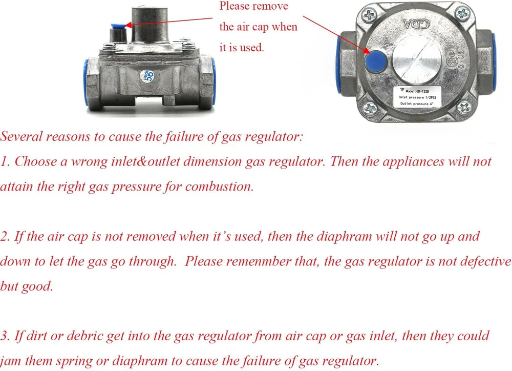 Store New Arrivals Add to Favorite View Feedback Contact Natural Gas Pressure Regulator with 3/4" FNPT Thread Inlet & Outlet Connection, with Maximum 1/2 PSIG Inlet Pressure and Range 3"-6" W.C. Outlet Pressure. Description Item model number GR-133B Part Number GR-133A Batteries Required? No Item Package Quantity 1 Product Dimensions 3.34 x 2.95 x 2.75 inches Country of Origin China Item Weight 9.6 ounces Batteries Included? No Model GR-133B Manufacturer HOSAILAY REPLACMENTS Product Description Several reasons to cause the failure of gas regulator Specifications Gas inlet & out size is 3/4"-FNPT. Please use the 3/4"-MNPT to connect the regulator. For natural gas appliances use only. Gas inlet pressure is 3/4 psi or 3,485 pa. Out let pressure is 4" WC or 1,750 pa (factory setting), adjustable from 3 to 6" WC. Maximum flow capacity is 150,000 BTU/Hr. Notes Too cold or too hot ambient temperature will affect the spring or diaphragm, and then affect the performance of regulator. If debris or dirt found inside affects the performance of regulator, please do not try to losen the screws to fix and repair it, or not, there will be gas leakage. Installation tips Please install this gas pressure regulator comply with the gas flow direction. Please do not install this gas pressure regulator too close or too far from the appliances. Please keep in mind that, the output pressure setting is different between natural gas source and propane gas source. If it is not a convertible gas pressure regulator, they are not alternative. ABOUT US We offer the best prices around on high quality products. Our E-store includes media such as books, movies, music and games while offering electronics, toys, sporting apparel, clothing, tools, general home, garden items and more. SHIPPING We are always working hard to ensure your package arrives as soon as possible. Please understand that some factors like weather, high postal traffic, and the performance of shipping companies are outside of our control. We offer free shipping to the lower 48 states and ship within 2 business days of payment, usually sooner. We do not accept P.O. Boxes. Please provide a physical address. RETURNS We offer a 30-Day Return Policy on items which you are not completely satisfied with. You have the option for a full-refund or an exchange of the item. No returns are available on items shipped outside of the USA. PAYMENT We accept PayPal. CONTACT US This page content is yet to come Please ad us to your favorite seller and visit again later Thank You CUSTOMER SATISFACTION We try our very best to make sure every customer is completely satisfied. If there's a problem, message us! We're happy to help.