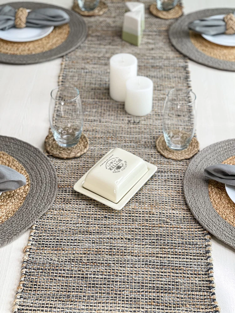 MATERIALS: Our weavers use all natural Jute fibers and intertwine them with recycled cotton yarns to make not only environmentally friendly but also elegant and trendy table runners . Style your tables for any dinner party or occasion with our ultra-chic and luxurious Jute table linen that is also eco-friendly. CONTENTS: Package contains one Jute/ upcycled cotton Table Runner. We also have matching table mats and napkins available HANDCRAFTED: Our weavers ensure that these heavy duty, boho-chic products are also excellent at resisting heat from hot plates and utensils and protect your table from splashes, heat and grime. VERSATILE: You can use these sustainable placemats and runners to cover and protect any surface including but not limited to tables, dressers, consoles, chests, bar, coffee shops, and desks. CARE: Our table products are not only easy to use but also relatively easy to clean. All you have to do is shake briskly and wipe with a damp sponge or cloth. Please do not machine wash- Spot Clean ONLY.