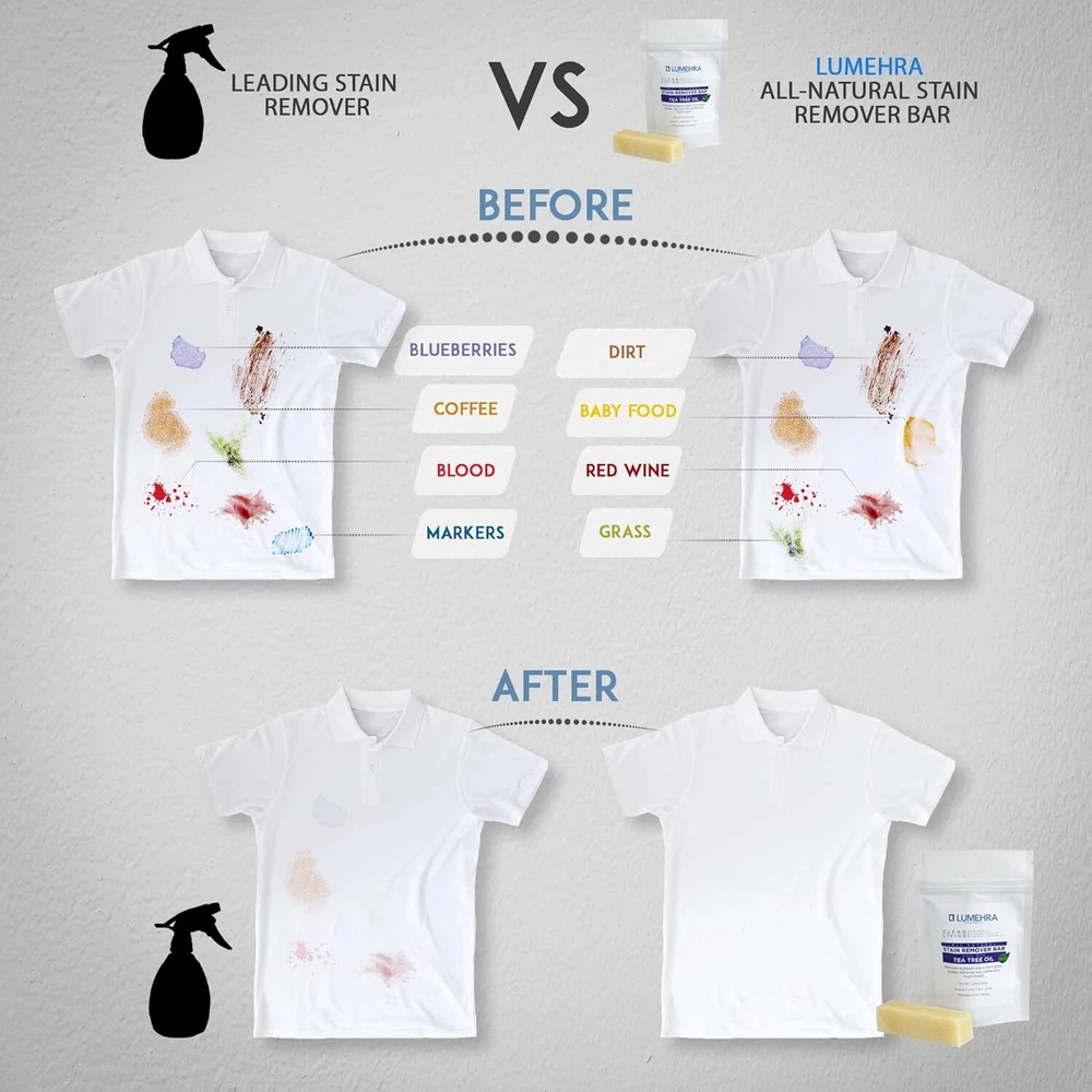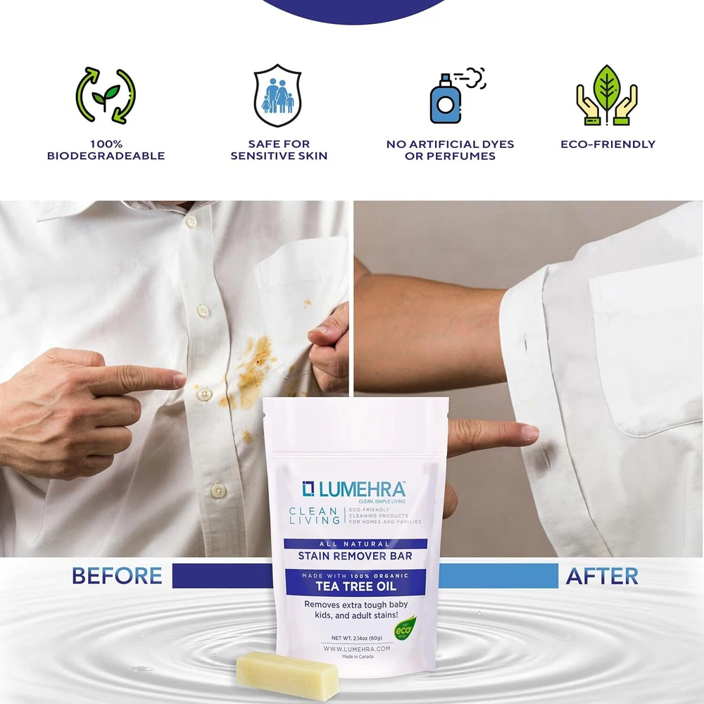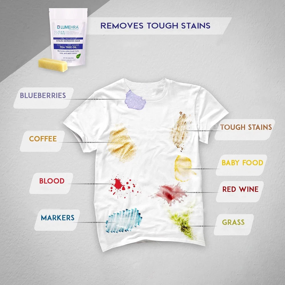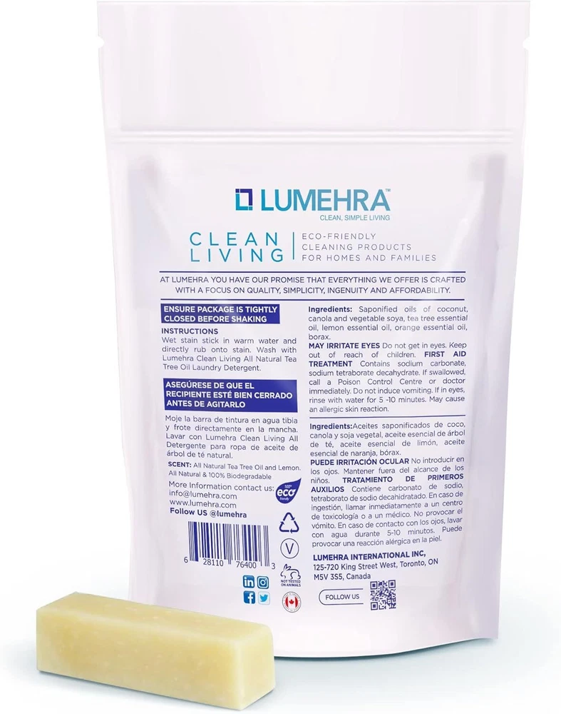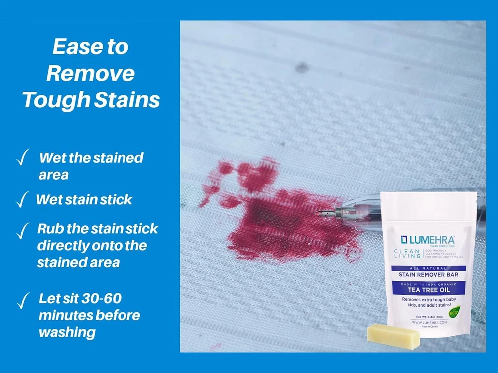 Natural Stain Stick - Removes Tough Baby Stain, Kids Stain, Food Stain on Clothes and Carpet Eco friendly, Biodegradable made with Tea Tree oil Essential Oils 60 gram laundry stain stick Product Details Is Discontinued By Manufacturer : No Package Dimensions : 4.2 x 1.8 x 0.2 inches; 1.59 ounces Manufacturer : LUMEHRA Brand: Lumehra Item Form: Stick Scent: Tea Tree Oil and Lemon Unit Count: 2.1164 Ounce Material Type Free: Fragrance Free, Animal By-Product Free, Bleach Free, Chemical Free, Paraben Free Effective Stain stick - Easy to use at removing tough stains including red wine, grease, grass, pet accidents, baby stains and more. Great for messy eater. Perfect for as carpet stain remover, furniture, baseball cap, clothes, laundry. Baby safe product and for kids, pets. On-the-go travel sizes as laundry stain remover Perfect for pre spot laundry stain remover Ease to use - wet the stain stick in warm water, rub it directly on the stain, then proceed to wash in the machine. For stubborn stains, let sit for 30-60 minutes before washing. Works wonders on sneakers, furniture, and leather. No need for pens, sprays or bleach stick. Our natural stain treater will last for months and months! Baby Safe, Sensitive Skin Safe – Lumehra’s natural stain remover stick is non-toxic, biodegradable, perfume free and non-irritating. Perfect stain remover for baby clothes, blankets, bibs wash cloths and diapers. Our eco stain stick is a natural stain remover for laundry for the entire family. Removes Tough Stains - Our laundry stain remover stick is prepared with essential oils that eliminate stubborn stains like grass, grease, coffee, blueberries, pet stains, blood, markers or tea. Even the toughest stains are no longer a problem, including hard water stain remover, and stain remover for clothes laundry Scent: Mild Tea Tree and Lemon scent. Tea tree oil removes the bad odor from your clothes and revive them for another good day! No perfumes or Toxins. Our Tea Tree essential oils help as a laundry laundry sanitizer