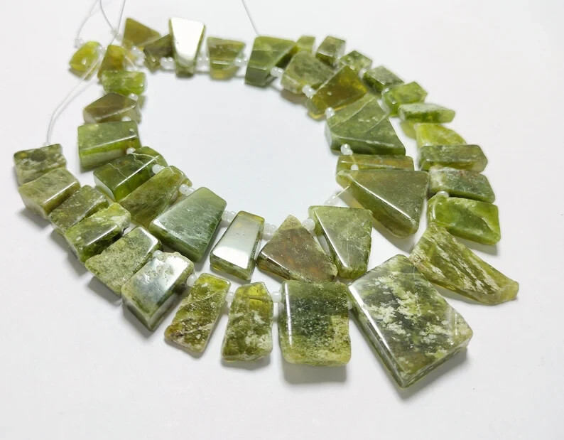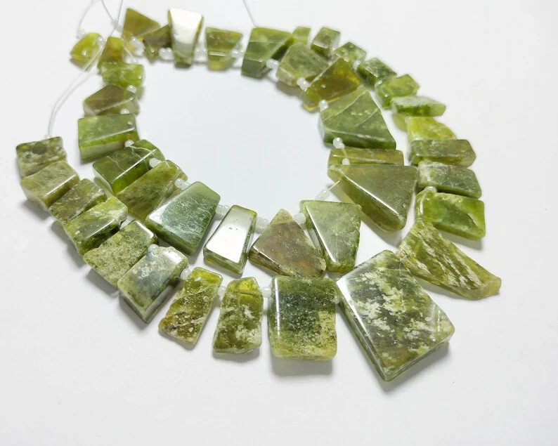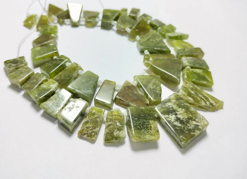 The product is a strand of handmade natural Vassonite beads in a fancy shape, ranging from 7x10 to 18x22mm in size. The beads have a smooth opaque finish and come in a green color. The strand is 8 inches long, perfect for jewelry making and crafts. Super Finest Quality 100% Natural Vassonite Gemstones Beads Shape------Smooth, Fancy Beads. Size------- 7X10 To 18X22 mm Approx Length-----8"Inch Strand Quantity---- 1 Strand