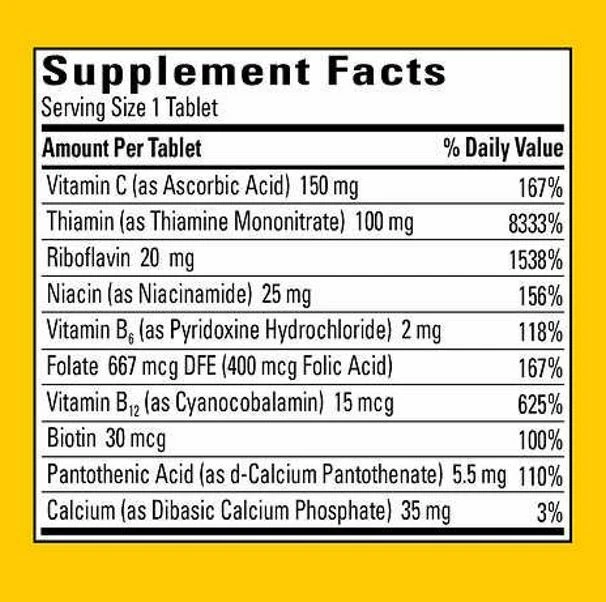 About This Item We aim to show you accurate product information. Manufacturers, suppliers and others provide what you see here, and we have not verified it. Nature Made® Super B-Complex formula contains key B vitamins that play a supportive role when it comes to the energy producing pathways of the body. They provide us with the energy we need to carry out our day. B vitamins are crucial for cellular energy production and normal function of your nervous system.Contains the 8 key B vitamins, plus vitamin CHelps convert food into cellular energyHelps support normal function of the nervous systemVitamin C is an antioxidant and helps support the immune system#1 Pharmacist Recommended Vitamin and Supplement Brand*Nature Made® Super B-Complex contains all eight B vitamins (thiamin, riboflavin, niacin, pantothenic acid, vitamin B6, biotin, folic acid and vitamin B12).B vitamins become especially important during illness, rigorous exercise and in times of stress. During these times, B vitamins may be excreted more rapidly from our body, thereby increasing our requirement.Supplementing with a B complex like Nature Made® Super B-Complex can help support our cellular energy production and healthy energy levels.All eight B vitamins are found in a variety of foods. Fortified cereal is a good source of several B vitamins, including riboflavin, niacin, vitamin B6 and folic acid.Whole grain cereals, lean pork, nuts and legumes are all good sources of thiamin. Avocado, fish and broccoli are good sources of pantothenic acid.In addition to fortified cereal, folic acid can also be found in green leafy vegetables and citrus fruit juices.*Based on a survey of pharmacists who recommend branded vitamins and supplements.Suggested Use: Take one tablet daily with a meal.Ingredients: Ascorbic Acid, Dibasic Calcium Phosphate, Thiamin Mononitrate, Cellulose Gel, Niacinamide, Riboflavin, Croscarmellose Sodium, Hydroxypropyl Methylcellulose, d-Calcium Pantothenate, Magnesium Stearate, Silicon Dioxide, Pyridoxine Hydrochloride, Folic Acid, Polyethylene Glycol, Biotin, Cyanocobalamin.No Artificial Colors. No Artificial Flavors. No Preservatives. No Yeast, Starch. No Gluten.Keep out of reach of children.Caution: Consult a physician before if you are taking any prescription medicatcations, including anticonvulsants.Energy production and Antioxidant support Formulated for easy absorption USP verified dietary supplement Indications: Health Concern: Energy Support Prenatal Health Explore this item Specifications Comparison Chart Features Manufacturer Brand Webcollage Comparison Table Assembled Product Weight Form Manufacturer Part Number Assembled Product Dimensions (L x W x H) You are viewing Nature Made Super B Complex Tablets , New Larger Count , 460 Count Nature Made Nature Made b03812f0c60f1a11fd4d1aa0d04cf468dc958811 0.7 Pounds Tablets CO580655 5.300 x 2.800 x 2.800 Inches Nature Made Super B-Complex Tablets, 160 count Nature Made Nutritional Products Nature Made 38bb63eaf39c6e47a06fc8ac5c3994a72191a1b3 0.3 POUNDS Tablets 4065 2.438 x 2.438 x 4.438 Inches Sundown Vitamin B Complex Tablets, 100 CT (Pack of 3) N/A Sundown Naturals e29e9c3a89f4ac6eb76a5dd218f968bd5895979b 0.4 Tablets 030768006013 5.0 x 10.0 x 10.0 Inches Nature Made Super B Energy Complex Softgels - 60 CT Nature Made Nutritional Products Nature Made b93c0e68db113d82e8efe1cb163fc16d963ab712 2.65 Gels 2865 0.1 x 4.5 x 0.1 Inches Spring Valley B100 Complex Timed Release Tablets, 60 Ct Wal-Mart Stores, Inc. Spring Valley N/A 0.117 lb Tablets b100 1.859 x 1.859 x 3.54 Inches Nature's Bounty B-Complex Time Released, Coated Tablets, 125ct Natures Bounty Nature's Bounty d4c8aac50492bda085d7b9a8b5777fcf5171fe36 0.28 oz Tablets 83168 1.98 x 1.98 x 4.17 Inches Spring Valley Super B-Complex Tablets, 250 Ct Wal-Mart Stores, Inc. Spring Valley 9fdad7bb9d86936fc77cea40910ae19f9e06f908 0.5 POUNDS Tablets WMT646287 2.75 x 2.75 x 4.81 Inches Vitafusion Adult B-Complex Gummies, Strawberry, 70 Ct Church & Dwight Vitafusion 2283a4b430802fd2b75c3411e0664f68010ceb9b 0.47 Gummy esd-fwe-slay07802 2.38 x 2.38 x 4.53 Inches Spring Valley Vitamin B50 Complex Timed Release Tablets, 60 Ct Wal-Mart Stores, Inc. Spring Valley N/A 0.096 oz Tablets WMT646282 1.859 x 1.859 x 3.545 Inches ~ Will be wrapped with care. ~ ~FREE SHIPPING~ Any questions, please feel free to contact us. Buy with confidence! Thanks for looking!