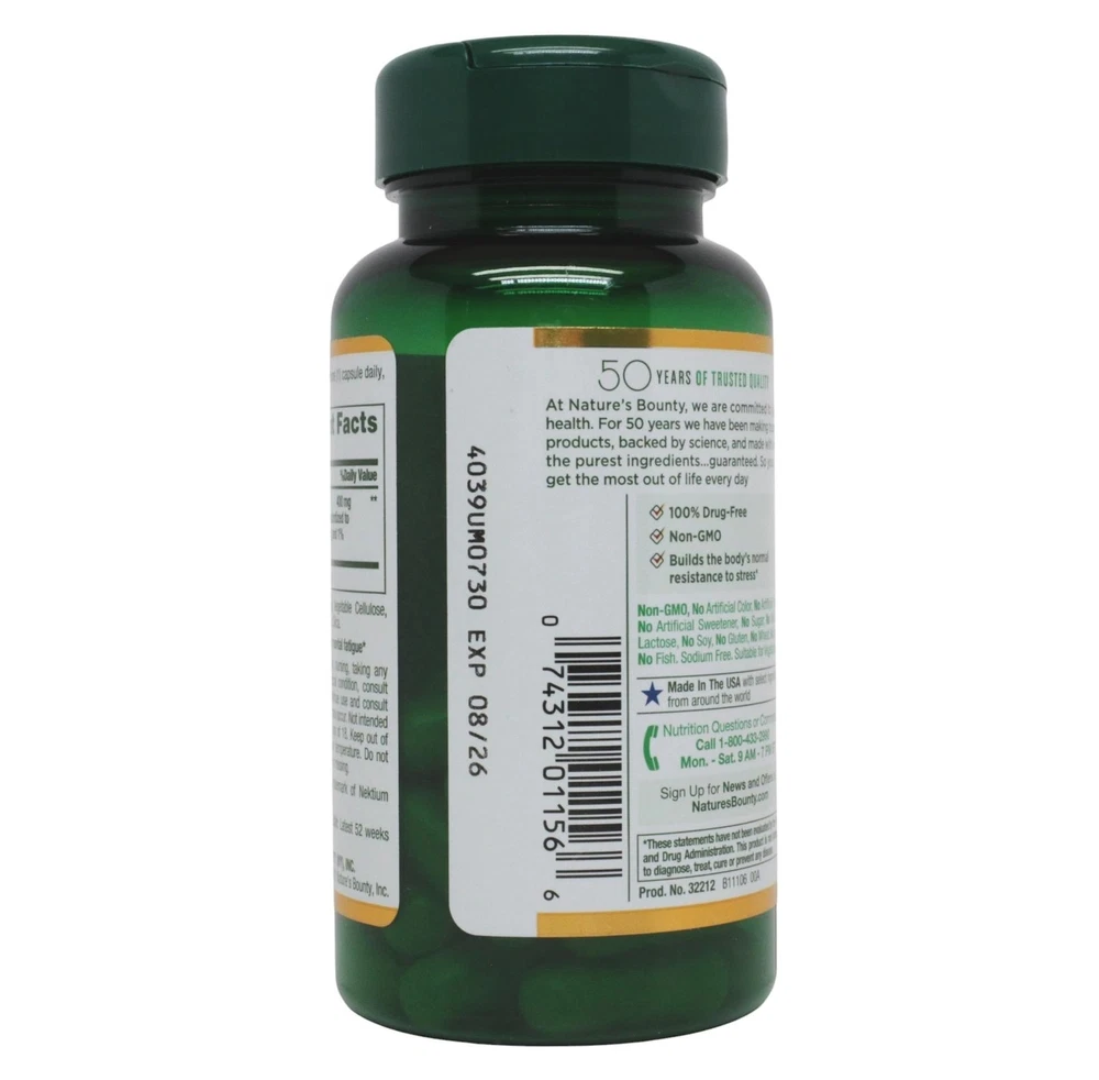 Nature's Bounty Mental Fatigue & Stress Relief Rhodiola 400mg Herbal Health 30ct Nature's Bounty Mental Fatigue & Stress Relief Rhodiola 400mg Herbal Health 30ct Features STRESS AND MENTAL FATIGUE SUPPORT: Natures Bounty Mental Fatigue & Stress Relief capsules help support occasional stress-related mental fatigue, such as the kind you get when studying hard for an exam or working long hours (1) BUILDS BODYS RESISTANCE TO STRESS: Natures Bounty Mental Fatigue & Stress Relief builds the body's normal resistance to occasional stress and helps support your ability to stay calm (1) 400 MG OF RHODIOLIFE: Natures Bounty Mental Fatigue & Stress Relief contains 400 mg of clinically studied ingredient Rhodiola for stress support. Rhodiola root is an adaptogen thats been used for centuries to relieve stress and reduce fatigue. (1) CONVENIENT CAPSULE: Convenient 1-per-day capsule makes it easy to include Natures Bounty Mental Fatigue & Stress Relief into your daily routine. UNSURPASSED QUALITY AND VALUE: Using the latest breakthroughs in nutritional science and the finest ingredients, Natures Bounty provides supplements of unsurpassed quality and value Details Item Weight: 0.11 pounds Shipping Weight: 0.11 pounds Item model number: 032212 Item MPN: 032212 Item part number: 032212 Fast & Free Shipping Orders are shipped out within 2-3 business days usually and delivered to your doorstep as quickly as possible. Competitive Pricing Our competitive prices are some of the lowest that you will find on the internet. Rest assured that you're getting a good deal when purchasing from us. 30-day Money Back Guarantee We are committed to making sure that you leave this transaction satisfied. If you're unhappy with the product for any reason, you may return it back for your money-back or a replacement if available within 30 days.