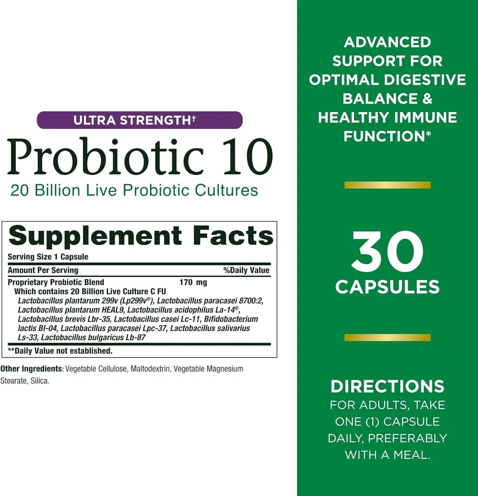 Nature’s Bounty Probiotic 10, Ultra Strength Daily Probiotic Supplement, Support for Digestive, Immune and Upper Respiratory Health, 1 Pack, 30 Capsules