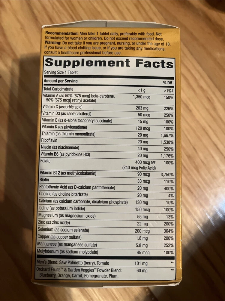EAN:0033674156919ISBN:0033674156919Ingredients:MultivitaminType:Does not applyColor:CreamPackage Dimensions LxWxH:4.88x2.72x2.68 Inchesgtin13:0033674156919MPN:NWY-15691Weight:0.35 PoundsUPC:0033674156919Model:Does not applySize:60 Count (Pack of 1)Brand:Nature'sDepartment:MenFormulation:Tablet