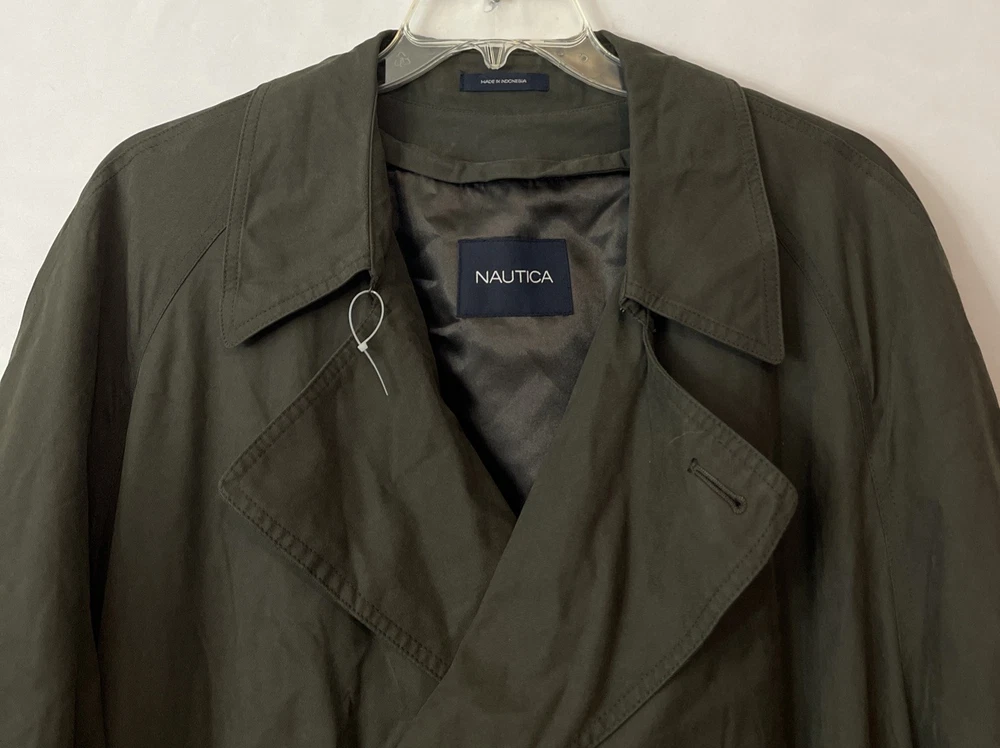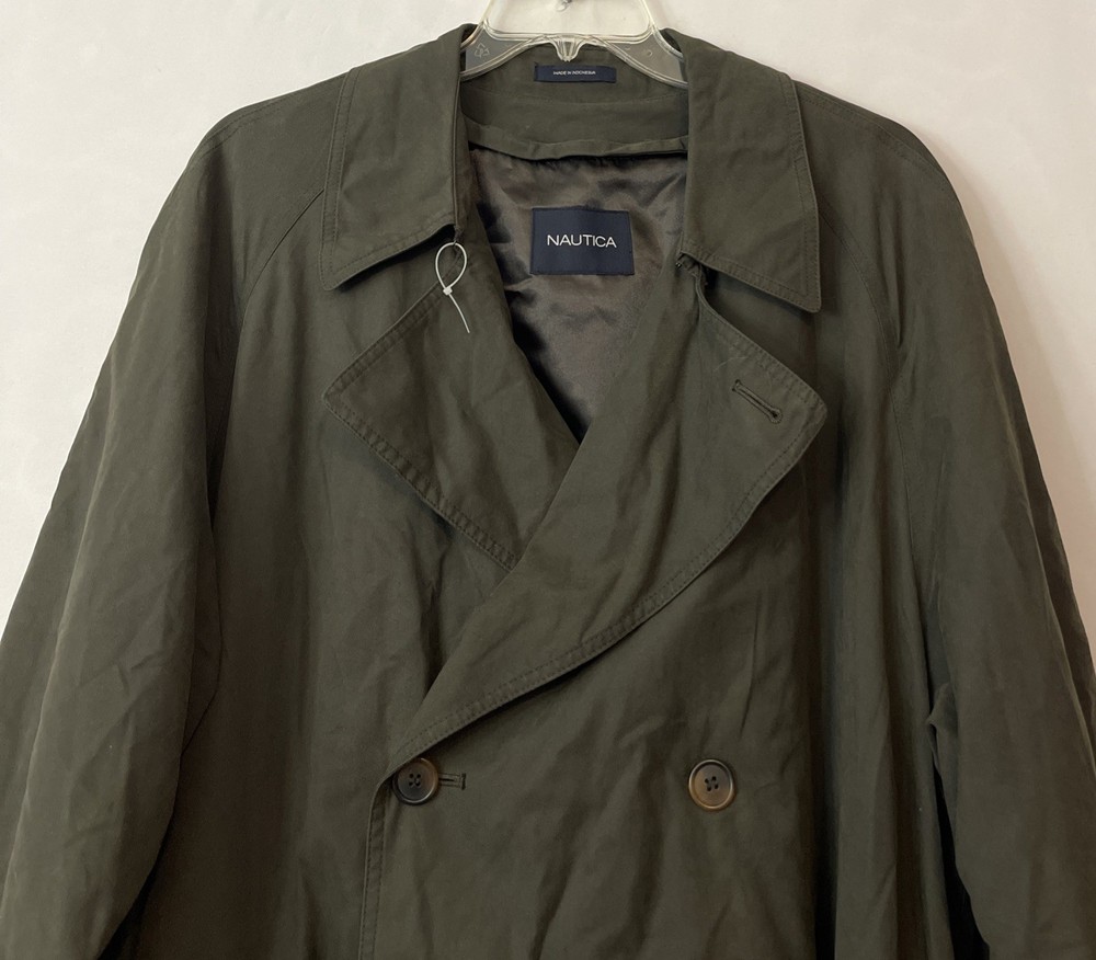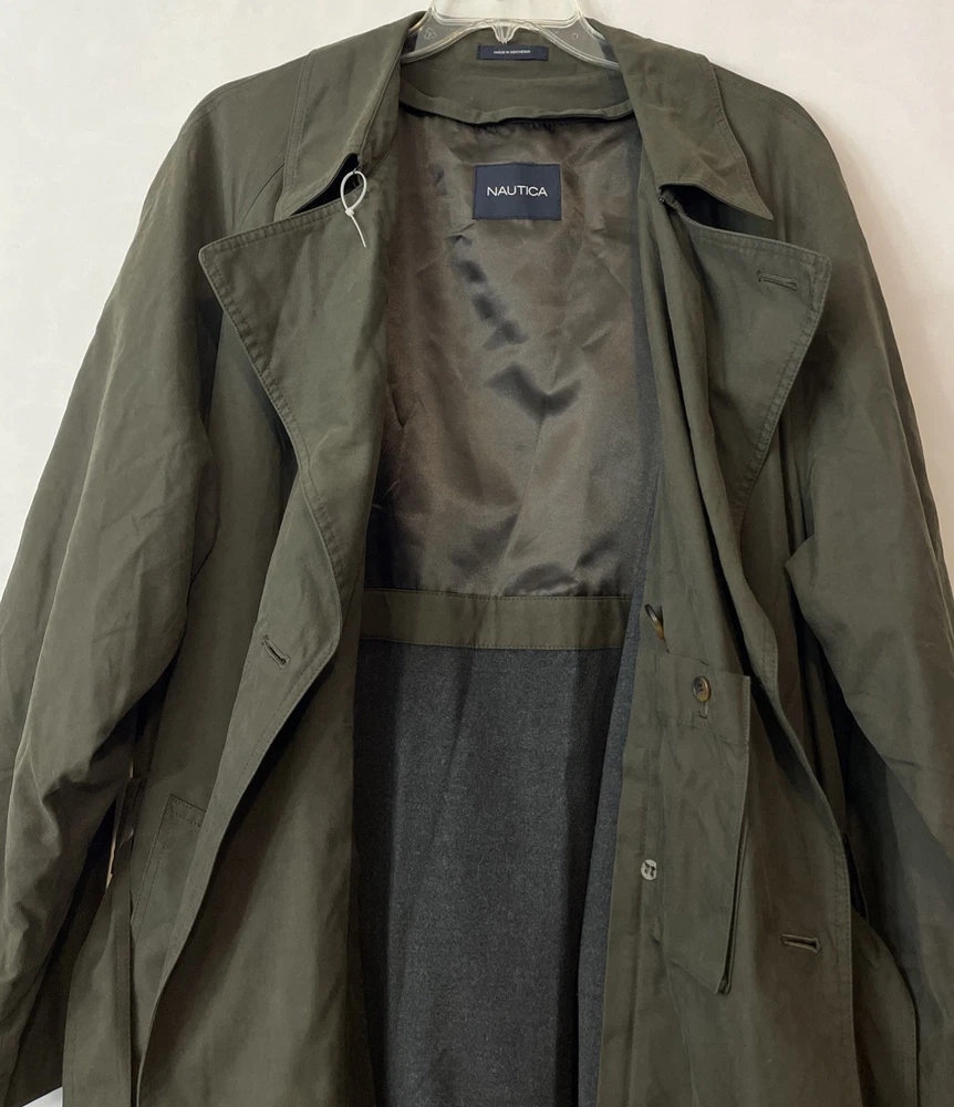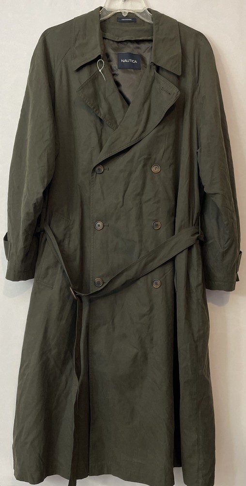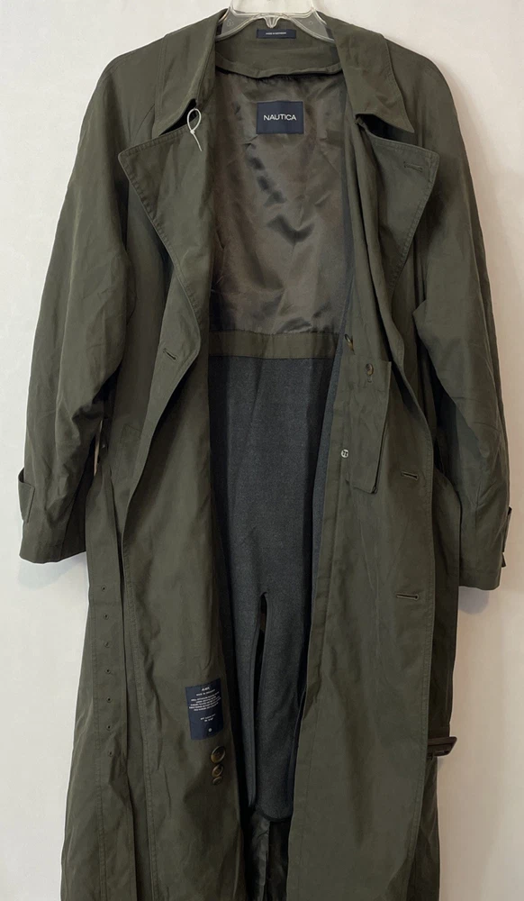 The Nautica Men's 44R Green Water Repellent Removable Warmer Long Trench Coat is a versatile and stylish outerwear option for various occasions. Made from a durable nylon polyester blend, this coat features a fold-down collar, double-breasted button closure, and removable warmer. The water-resistant and breathable fabric makes it ideal for winter, fall, and spring seasons, while the insulated design provides added comfort. With its classic trench coat style, this Nautica coat is perfect for business, casual, or formal wear, offering both functionality and a touch of designer flair. The green color and solid pattern add a pop of color to any outfit, making it a must-have for the modern man's wardrobe. Length: 51 inches. Chest: 26 inches across laying flat.