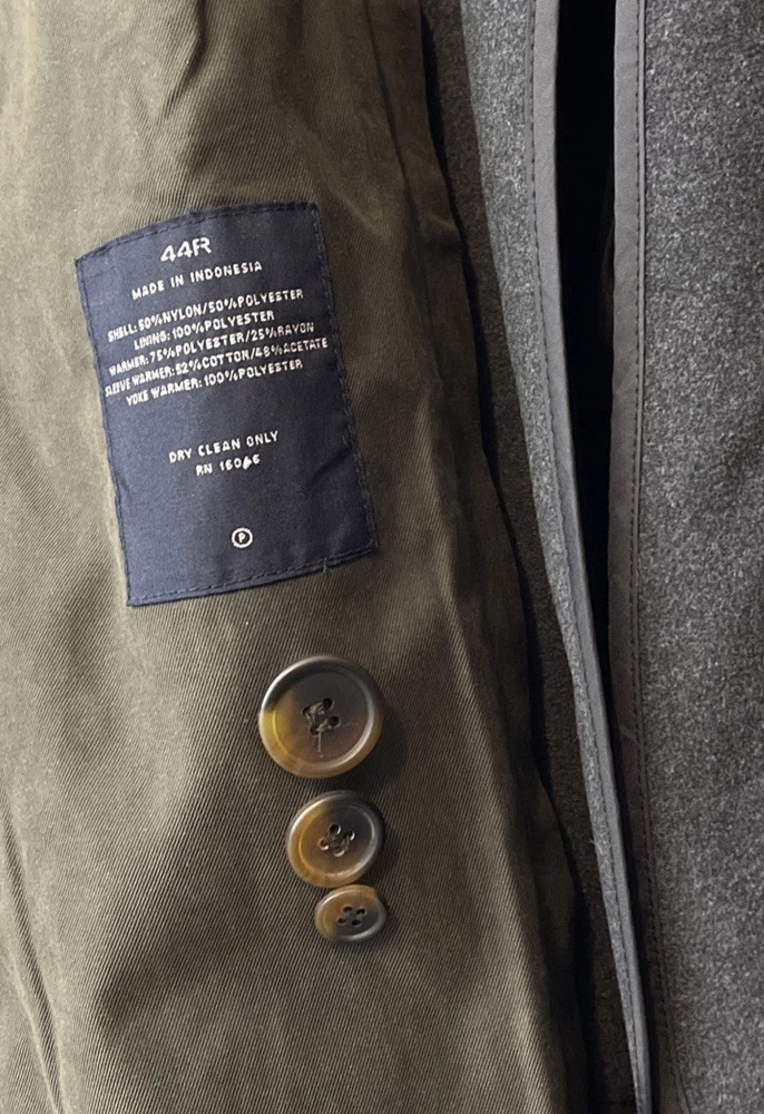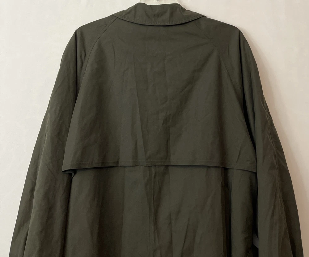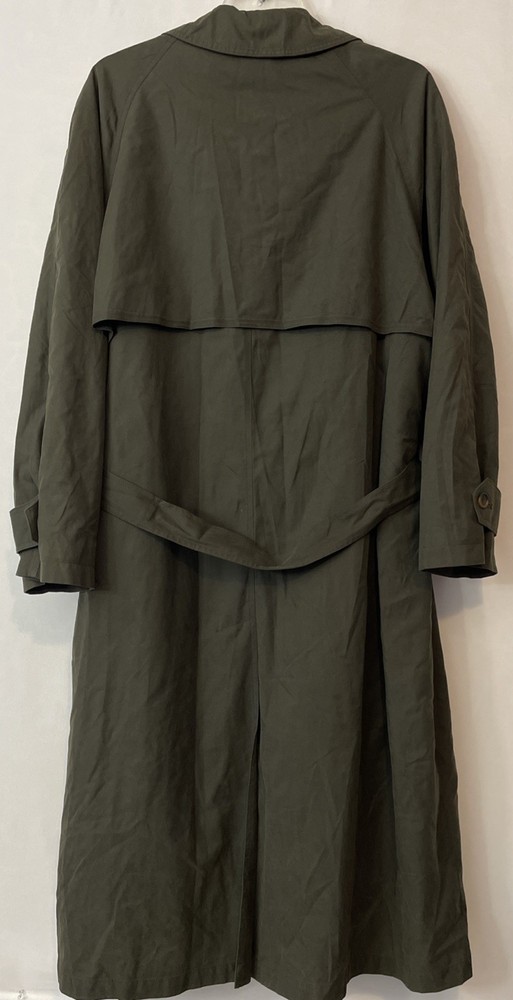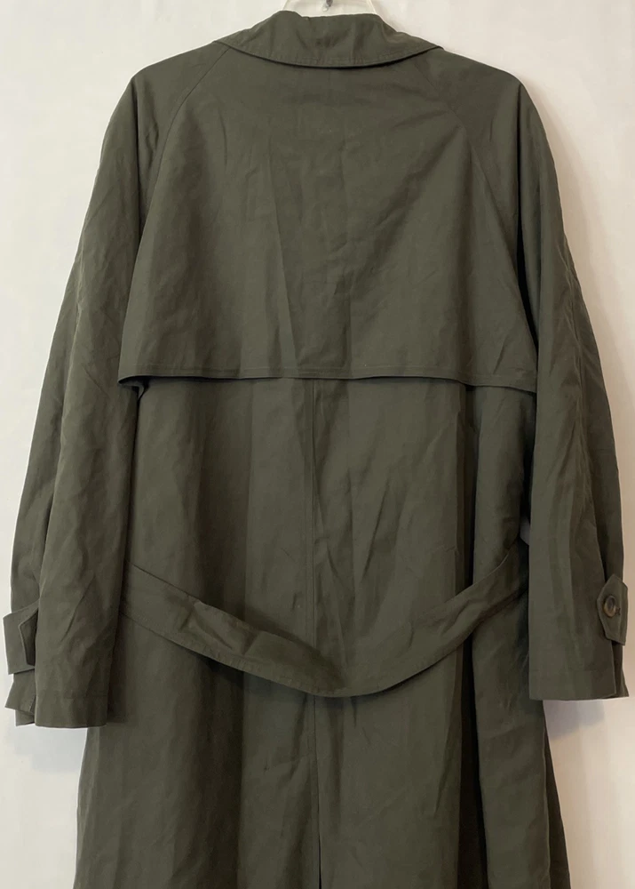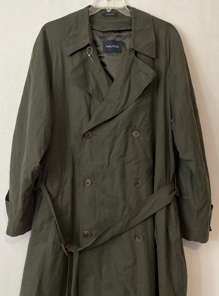 The Nautica Men's 44R Green Water Repellent Removable Warmer Long Trench Coat is a versatile and stylish outerwear option for various occasions. Made from a durable nylon polyester blend, this coat features a fold-down collar, double-breasted button closure, and removable warmer. The water-resistant and breathable fabric makes it ideal for winter, fall, and spring seasons, while the insulated design provides added comfort. With its classic trench coat style, this Nautica coat is perfect for business, casual, or formal wear, offering both functionality and a touch of designer flair. The green color and solid pattern add a pop of color to any outfit, making it a must-have for the modern man's wardrobe. Length: 51 inches. Chest: 26 inches across laying flat.