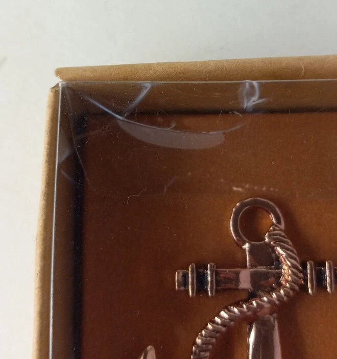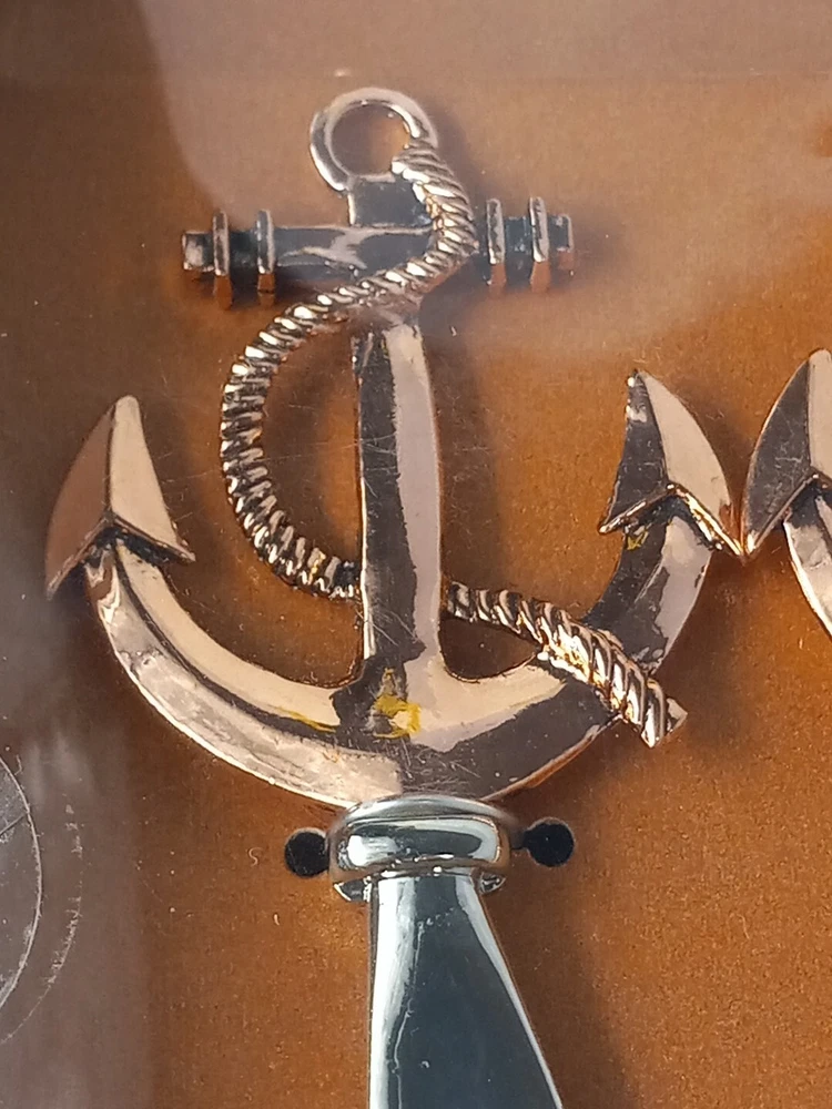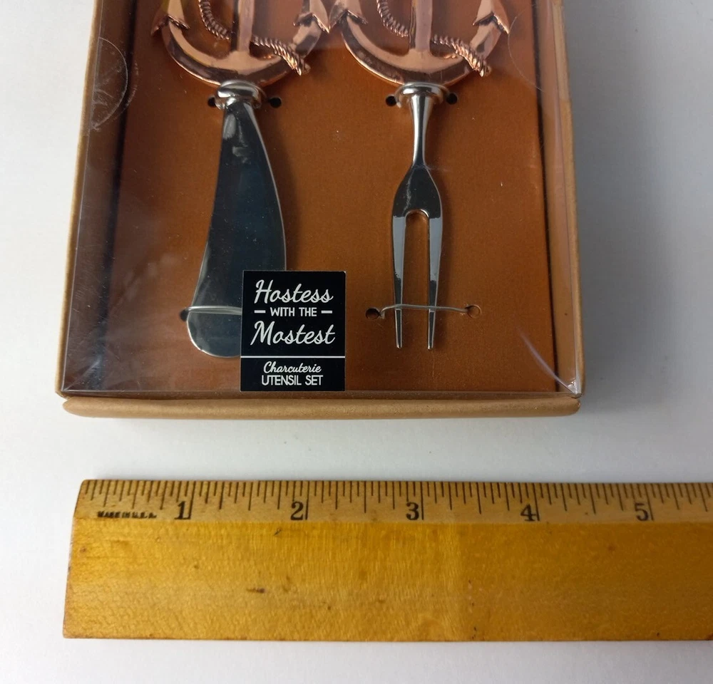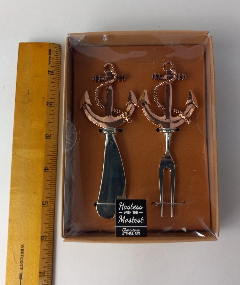 Nautical Hostess with the Mostess Copper toned Anchor Charcuterie Knife and Fork Utensil Set 4.5 inch. See pictures for measurements. PLEASE NOTE: plastic cover has some dents, see pictures. Will combine shipping on multiple orders. Shipped from smoke free environment. Fast shipper!