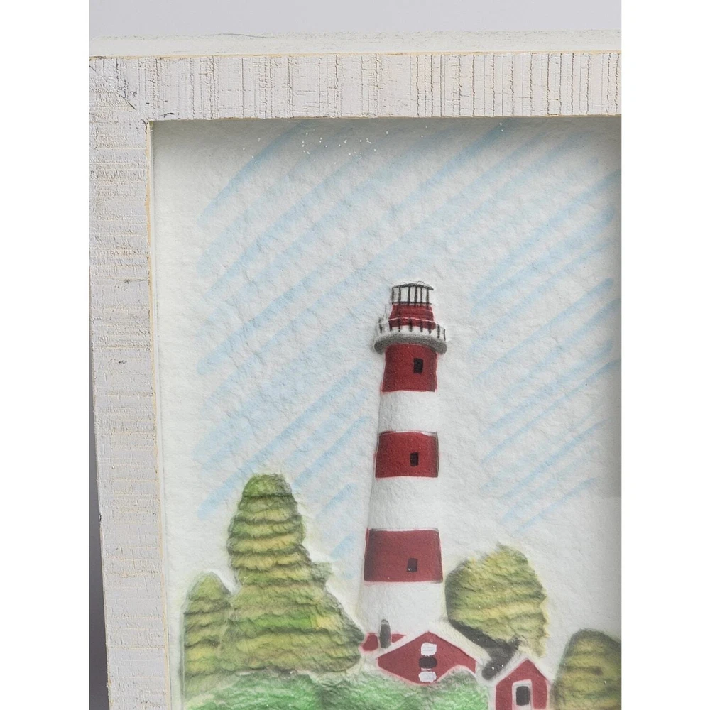 Nautical Themed Framed Picture Shadowbox 3D Lighthouse with Real Sand Décor • Nautical Lighthouse Shadowbox w/ Actual White Sand • Hand Cast Paper Art 3D Intricate Production Technique Used • Involved casting he paper by hand & painting the embossed paper • Framed in a shadowbox with sand for a unique textured look. • A Mixed-Media or Collage Artwork Style • Perfect for any nautical lovers home or office! • Measurements: 12” x 7.5” Pre-Owned / Used: A product that has been used previously. View our listing for full details in our description and check out our photos provided. If there are any imperfections, it will be noted in the description and/or within the provided photos. We appreciate you looking at our listing. Before placing an order, feel free to ask any questions you may have about this item. Upon receiving your order, if you are not satisfied with your order, please contact us and we will address any issue.