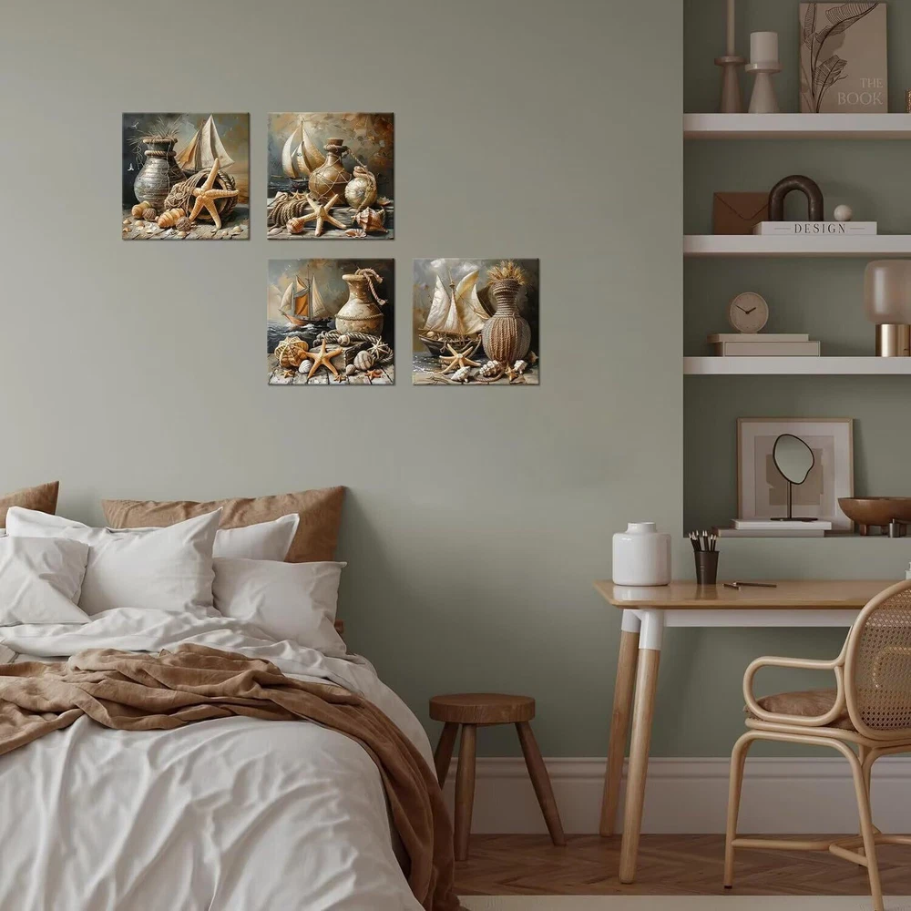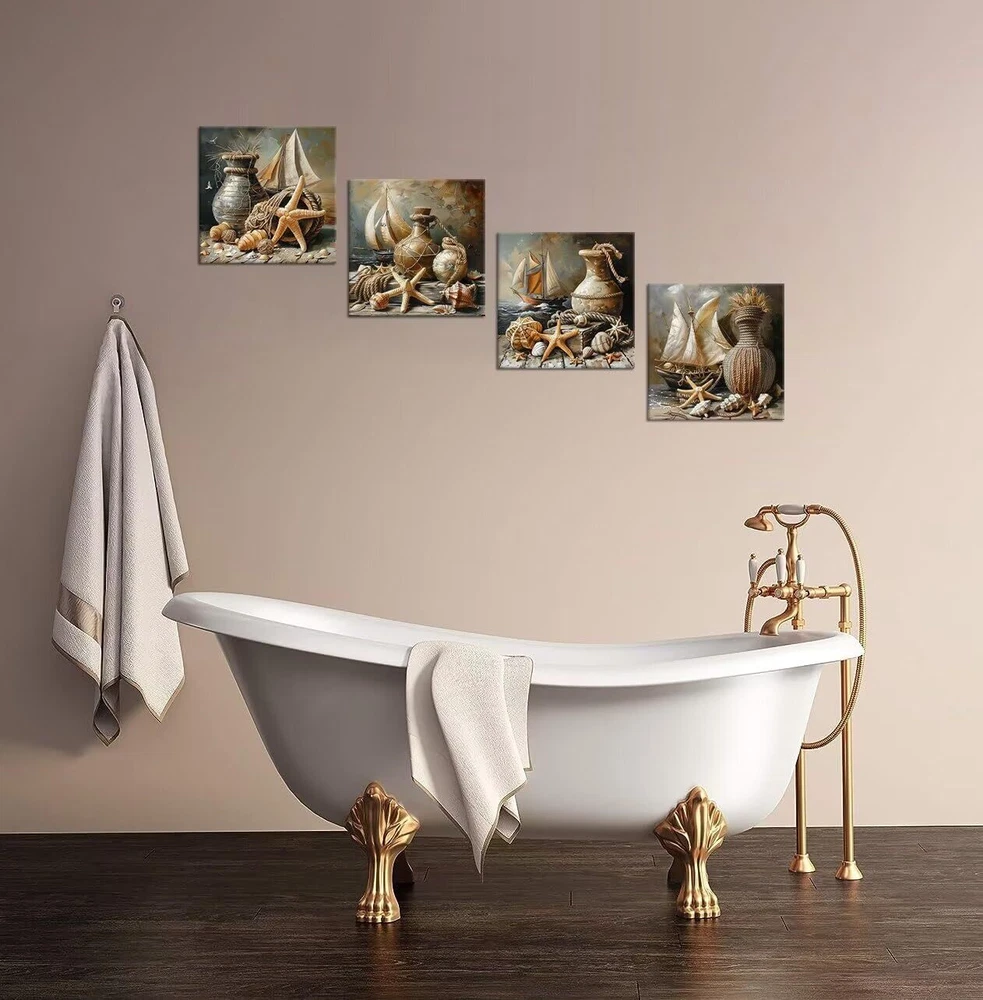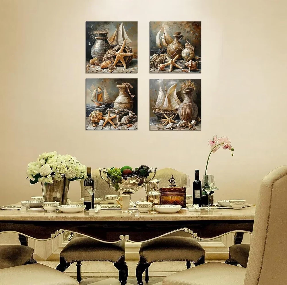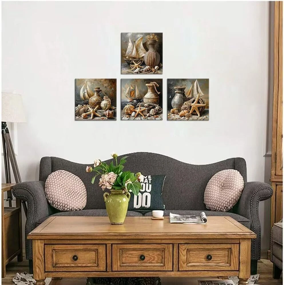 Package Including: 4 Panels of Wall Art Product Feature: - HD print canvas art wall decorative painting. Won't lose color and is waterproof. - The side margins are also printed to create a particularly decorative effect. - Each panel has an environmentally friendly frame and black hook that can be hung directly to your wall. - Stable logistics , Wonderful packaging, make sure you receive the bathroom wall art on time. - A great canvas wall art painting for home decor, bedroom, living room, study, hallway, kitchen, office, hotel, cafe, hall, dining room, office, bathroom, bar, Spa, Lounge wall decor, etc. Wonderful Gift Idea: 1. Canvas wall art for weddings, anniversaries, Thanksgiving, Christmas, mother's Day, father's Day, valentine, birthdays, and others. 2. Framed wall art is the great gift idea for your grandma, mom, dad, wife, husband, sister, brother, , and other beloved ones with surprising designs. Tips: - Please confirm the size of the abstract wall art before purchase to prevent buying an unsuitable size. - Please us if you need to customize the size and picture. WALL PAINTING SIZE: 12 inch x 12 inch/ Panel, Each panel is 30x30cm. Nautical style pating make your home vibrant and mystery. Each canvas wall art size can be personalized made. HD Print Wall Art: High Definition giclee prints artwork, print on polyester canvas. Inkjet printing, environmentally friendly non-odorless imported ink, waterproof moisture-proof UV! A wonderful Vintage art craftsmanship artwork enhances the quality of your life. Easy To Install: The Nautical wall pictures Installation takes just three steps, opening the courier package, installing seamless studs and hanging artwork. A simple three-step process will make your room great. Each panel internal and external packaging is strictly required to ensure a variety of transportation protection. Special Gift Options: High-end home decoration wall painting is the good gift for your lover, family or friends. It can be used in the office, school, home decor, bedroom anywhere you see. Having a piece of art will make your mood pleasant and add a touch of color to your boring life. [SATISFACTION SERVICE] We are committed to providing high-quality canvas print paintings, and satisfactory service.