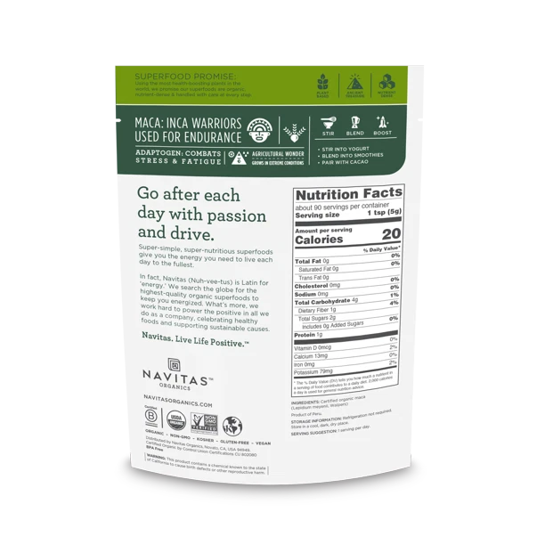 About This Item We aim to show you accurate product information. Manufacturers, suppliers and others provide what you see here, and we have not verified it. Navitas Organics Raw Maca Powder balances the body's delicate endocrine system, supporting natural energy and vitality—without the undesirable effects of stimulants. It's a fiber-rich food and a good source of plant protein—about 10%. Maca root is also packed with essential fatty acids. Navitas Organics Maca Powder is full of non-traditional nutrients that aren’t accounted for on the standard nutrition label, yet are vital to fighting day-to-day stress, and enabling health and well-being.Treasured by ancient Inca warriors, Maca has been used for thousands of years to increase energy & stamina; Adaptogen: Balances the body's hormonal system & supports ability to respond to stress Indications: Health Concern: Energy Support Mood Support Circulatory Health Boost Energy Anti-Stress Support Warnings: proposition 65 reasons:This product contains chemicals knows to the state of California to cause birth defects or other reproductive harm. This product contains chemicals knows to the state of California to cause birth defects or other reproductive harm. Ingredients: Ingredients: CERTIFIED ORGANIC MACA Directions: Dosage: 1.00 Teaspoon(s) Instructions: Good Product Explore this item Specifications Nutrition Facts Comparison Chart Features New Small Parts Warning Code Gender Vitamin & Supplement Type Warning Text Assembled Product Weight Assembled Product Dimensions (L x W x H) Manufacturer Contains Paper/Wood Is Temperature-Sensitive Count Volume Unit Form Manufacturer Part Number Contained Battery Type Is Drug Facts Label Required Model Segregation Brand Webcollage Comparison Table Contains Batteries N 0 Female Superfood proposition 65 reasons:This product contains chemicals knows to the state of California to cause birth defects or other reproductive harm. 1.0 2.30 x 5.80 x 8.30 Inches Navitas Organics N N 90 Each Powders NAV00051 Does Not Contain a Battery N NAV00051 1 Navitas Organics ebb953f09526f939c69dd75485712028c4a32f16 ~ Will be wrapped with care. ~ ~FREE SHIPPING~ Any questions, please feel free to contact us. Buy with confidence! Thanks for looking! Navitas Organics Maca Powder, 8.0 Oz, 45 Servings Y 0 Male Superfood This product contains a chemical known to the state of California to cause birth defects or other reproductive harm. 0.53 8.60 x 6.20 x 2.20 Inches Navitas Organics N N 45 g Powders 00N0JC3I504CHH8 Does Not Contain a Battery N 11-003 1 Navitas Organics 4f12c9e6ea56c1f2dec966e3a3ffceb8aea67254 N Navitas Organics Gelatinized Maca Powder, 4.0 Oz, 25 Servings Y 0 Male Superfood This product contains a chemical known to the state of California to cause birth defects or other reproductive harm. 4.32 187.96 x 5.15 x 7.40 null Navitas Organics N N 1 g Powders 004HJ24744T6794 Does Not Contain a Battery N 12-005 1 Navitas Organics 0f70f8bf861c3f585563eac2ef8060fc5b11939a N Terrasoul superfoods organic gelatinized maca powder, 1.0 lb N 0 N/A Superfood N/A 1 lbs 6.75 x 3.19 x 9.75 Inches Terrasoul Superfoods N N 16 Each Powders 858789004272 Does Not Contain a Battery N 858789004272 1 Terrasoul N/A N Sunfood Superfoods Organic Red Maca Powder, 1.0 Lb N 0 N/A Superfood proposition 65 reasons:WARNING: This product contains a chemical known to the state of California to cause birth defects or other reproductive harm. 1.0 11.5 x 4.0 x 7.0 Inches Sunfood N N 16 Pound N/A 1264 Does Not Contain a Battery N/A 1264 1 Sunfood Superfoods N/A N NOW Supplements, Maca (Lepidium meyenii) 500 mg, For Men and Women, Reproductive Health*, 250 Veg Capsules N 0 Female Dietary Supplements These statements have not been evaluated by the FDA. These products are not intended to diagnose, treat, cure, or prevent any disease. 0.44 oz 2.81 x 2.81 x 5.13 Inches NOW N N 250 Each Veg Capsules 04762 Does Not Contain a Battery N 00T9JIKCQAJBFJ3 1 NOW 92b349ddc100026a7c4434683a5ff874f07a3eab N Navitas Organics Gelatinized Maca Powder, 8.0 Oz, 45 Servings N 0 Male Superfood Allergen Information: Packaged in a facility that also handles tree nuts (cashews & coconut). 8.31 oz 8.20 x 6.20 x 2.30 Inches Navitas Organics N N 1 mg other 00A5H041E69GQ5C Does Not Contain a Battery N
