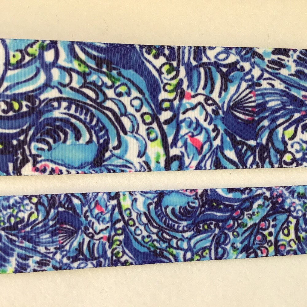 Beautiful Palm beach inspired grosgrain ribbon priced by 1, 2, 3, 5 or 10 yard lengths. 7/8" 1.5" Beautiful blue Colors If purchasing multiple units, the ribbon will come as one continuous piece. Ribbon is printed on one side and white on the reverse. We are available for questions Monday through Friday during business hours for specific questions about any items, shipping and more. E-bay considers a 5 Star feedback standard for all purchases. If for any reason you have any concerns with your purchase(s), please let us know directly and soon after receiving your purchase and we will do our best to work out a solution. Most of our transactions go smoothly as you can see through our great feedback scores however occasionally errors or misunderstandings can occur in our listings so please let us know! Returns and exchanges are accepted however the item must be in the same condition that it was sent. For example it must still have the tags attached and not be worn or laundered. Return shipping is the responsibility of the buyer. All of our packages are tracked domestically and some internationally as well. We combine shipping costs whenever possible so please request an invoice when purchasing multiple items as sometimes the e-bay calculation is higher than our shipping cost and we want to pass the savings back to you. Please make sure that you have your correct address on file with Pay Pal when placing your order. Overnight shipping is available Monday through Thursday if you order in the morning. Please contact us for details. For INTERNATIONAL BUYERS, your purchases are sometimes held at your post office for pick up and additional taxes may be due and payable to them. These additional costs vary by country and it is your responsibility to understand what and when these additional charges may be required prior to purchase.