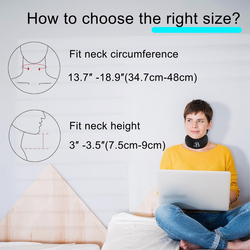 Our neck collar adopts an ergonomically designed "V" shaped foam pad that conforms to the neck and jaw lines, providing a comfortable fit, lightweight support and stability for the head and neck, and helping to maintain the neutral position of the spine. Smooth and delicate ice silk fabric is breathable, ensuring dryness. Its excellent skin friendly performance keeps you comfortable during long-term use, and the detachable fabric cover can be cleaned. It can also be worn while sleeping. 1.Our neck brace meets a variety of needs, whether it's during the daytime at work, at night when you're relaxing, or even when you're traveling long distances, our non-rigid support neck brace provides you with comfortable support all day long. 2.The neck brace for women can be used as a neck brace for sleeping, which restricts the angle of movement of the cervical spine while sleeping, realizing passive protection of the cervical spine to avoid stiff neck after sleep. 3.The soft cervical collar is designed with Velcro straps that do not stick to hair, allowing you to freely adjust the length of the cervical collar according to your needs and prevent pain caused by movement. 4.The neck brace is made of high quality soft cotton. The inner core of the cervical collar is odorless and breathable, and the skin contact area is made of unidirectional moisture-conducting fabric, which can keep the neck fresh and ensure maximum comfort even after long time wearing. Ergonomic Cervical Collar: The cervical collar features an ergonomic V-shaped design that curves precisely around the chin and neck to distribute pressure and provide firm support. The collar fits snugly around the neck to ensure a comfortable fit. Adjustable Neck Stretcher:The Neck Stretcher features an adjustable design that allows you to adjust the length of the cervical support to suit your comfort and needs. Simply wrap the neck stretcher around your neck and secure it with Velcro.The cervical support is suitable for neck circumferences between 13.7 and 18.9 inches. Neck Traction Device: The neck braces for neck pain and support help relieve neck pain and stress by seamlessly fitting the contours of the neck and jaw, providing much-needed support and reducing pressure on the neck muscles. Comfortable Foam Material: The interior of the neck support brace is made of soft cushioning foam material. It provides greater comfort and cushioning for your neck without sacrificing support. The outer layer is made of smooth and breathable ice silk fabric provides a different skin-friendly experience for all-day wear. Excellent Portability:Our neck support can be easily rolled up and carried, and you can use it almost anywhere to stretch your neck, reduce neck pressure and relieve pain. It provides comfortable support all day long. Whether you work during the day, relax at night or sleep.