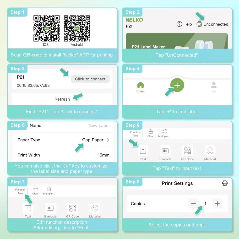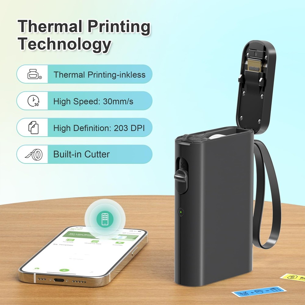 2025 New Version: Compared with the traditional label makers, half weight and size of the traditional label maker, smaller, smarter and convenient for users to carry. Wireless bluetooth label maker can slip into your pocket, allow printing anytime, anywhere. We recommend using our NELKO thermal label paper for good printing quality. Attention: For P21 Nelko APP iOS Users, Please update Nelko APP to the latest version V3.1.0 and iOS App compatibility requires iOS 13.0 or later High-quality Printing: Label Makers with BPA-Free Direct Thermal Technology. Equipped with high-speed chips and 203 DPI, you can enjoy high-definition without relying on ink or toner. Label maker built in durable rechargeable battery, it can work for a long time. This label maker is monochrome printout, which only prints black text. We can create color label and need to use color pattern label tapes for printing.(Note: Not including charging adapter, not suitable for fast charging adapter) Easy to Use: NELKO label printer compatible with IOS & Android via bluetooth connection. Step 1: Download "Nelko" APP from Google Play or App Store. Step 2: Install the paper roll. Step 3: Connect the P21 bluetooth within APP. Step 4: Choose a quick template and start printing. It is not compatible with Google phones on Android 14. This label maker machine with tape APP included more than 90 +Fonts, 10+ Languages, 450+ Materials. (Note: This label maker doesn't work with computers) Multiple Creative Function&Templates: This app of the label maker provides various features and templates, easy to create various design label stickers from App with Text, QR code, Barcode, Materials, Images, Time and Borders, etc. The length of labels is fixed, including 12X40mm, 14X40mm, 14x50mm, 14x75mm, and more. Please do not tear or destruct the green sticker on the back of the label strip , otherwise it will affect the printing effect. (Note: Continuous label tapes are not supported) Design Your Own Labels: The label maker machine with tape is widely used in life and office. For Home, organizing your clothes, food storage, cosmetics items, and mailings. For Office, office organization includes notebook tags, price tags, reminder tags, and other office supplies. For School, label maker for classroom teacher and kids school items, personal item identification, name tags. Labeler makers bring you fun and convenience