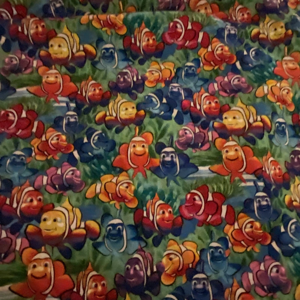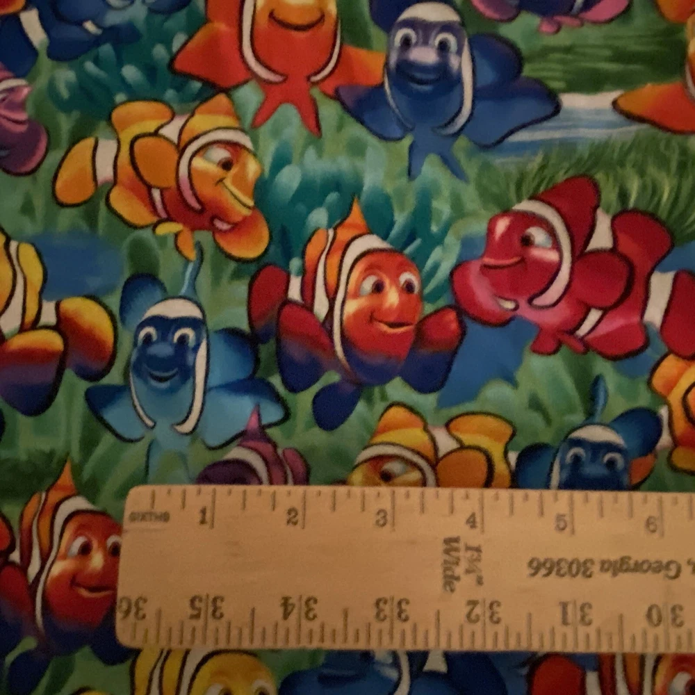This Nemo Cotton Fabric by Timeless Treasures is perfect for all your crafting needs. The fabric is made of high-quality cotton material and comes in a beautiful multicolor pattern of Nemo and Dory Fish. It is suitable for sewing, quilting, and crafts, and has a length of 1 yard plus 22 inches with a tail x 33” width with one selvage intact. The fabric is designed by Michael Searle for Timeless Treasures. Comes from pet and smoke free home. Fabric has been recently laundered.