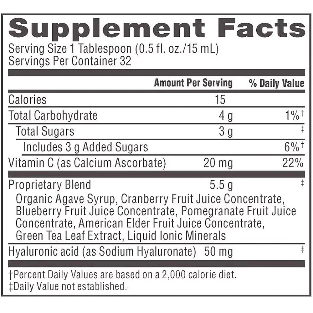Features: Provides most bio-available form of hyaluronic acid Holds 1000 times its weight in water for cushioning of joints Assists in cell turnover in the skin Powerful aid in skin hydration and wrinkle reduction Lubricates the surface of the eye Hyaluronic Acid Blueberry Liquid is an expertly crafted blend of Hyaluronic Acid (HA), Vitamin C, and antioxidants to support hydration and protection of tissue in the skin, joints, and eyes. HA is an important disaccharide found in every tissue of the body as an essential lubricant and promotes cell turnover. HA is one of nature's most water loving molecules responsible for the control of tissue hydration and water transport between cells. Ingredients: Hyaluronic Acid, Proprietary Fruit Blend (Organic Agave Nectar, Pomegranate Concentrate, Blueberry Concentrate, Cranberry Concentrate, Elderberry Concentrate, Green Tea Polyphenols (50%), and Liquid Ionic Minerals), Purified Water, Natural Flavors, Citric Acid and Potassium Sorbate, and Silicone Dioxide. Direction: As a dietary supplement, take one (1) tablespoon (1/2 fl ounce) daily, alone or mixed with six ounces of water, fruit juice or herbal tea. Safety Warning: Refrigerate after opening. Keep out of reach of childrne. If you are pregnant, nursing, or have a medical condition, consult your physician before using this product. Legal Statement: *These statements have not been evaluated by the Food and Drug Administration. This product is not intended to diagnose, treat, cure or prevent any disease.
