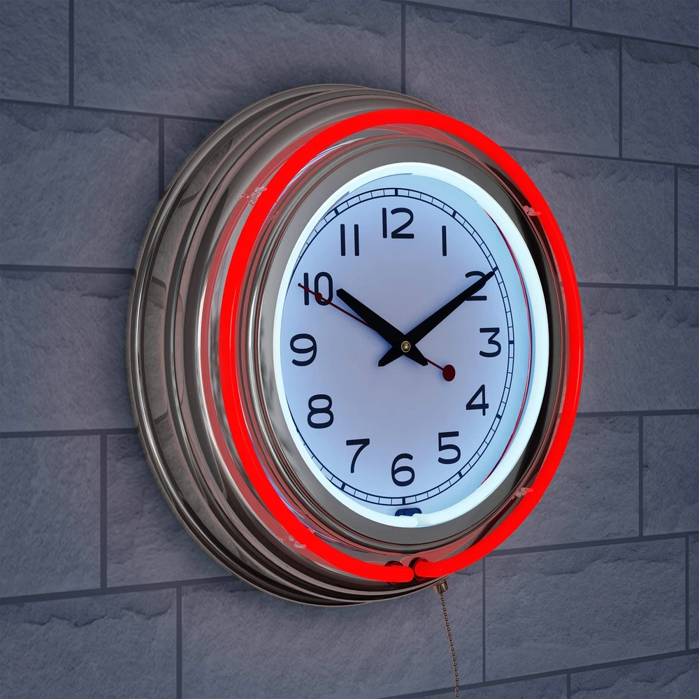 Kick it old school in your bar or game room with this nostalgic Neon Wall Clock by . The perfect clock for bedroom display or use in your entertainment space, this chrome-finished wall clock boasts double neon rings - one vibrant neon blue one around the exterior and one white band that illuminates the clock face on the interior, creating an eye-catching glow that's simple to spot from across the room for easy timekeeping. The battery-operated design makes this large wall clock ideal for use in areas without access to electrical outlets, such as on covered porches, and mounts on the back enable easy display as a hanging kitchen wall clock or retro wall clock for the bedroom. IMPORTANT: is committed to providing the consumer with the absolute best price and value on our entire line of products. NOTE: This is an exclusive product of and ONLY Neon Wall Clocks by are GUARANTEED to be genuine. Avoid buying counterfeit products and transacting with unauthorized sellers. BATTERY-OPERATED WALL CLOCK - Give your entertainment space a 1950's-era feel when classic cars and cherry sodas were all the rage. Retro design features like a white neon inner band and blue neon outer band brighten the room and your mood. VERSATILE POWER - Plug this wall clock in via the 6-foot cord or pop in 2AA batteries for a cordless way to keep the time. This large wall clock comes with a 110-volt AC adapter for easy views of the brilliantly colored lights right out of the box. EASY SETUP AND USE - Depend on this garage and game room wall clock for easy setup and use. Pull the chain on the bottom to toggle between the solid-state and blinking neon light display modes, and mount this wall clock simply via the hole on the back. FLEXIBLE PLACEMENT - Showcase this nostalgic wall clock inside your home or put it to work on your porch or patio. Outdoor spaces like three-season rooms or covered patios and decks make a great space for this round analog clock. PRODUCT DETAILS - Materials: Quartz Mechanism, High-Grade Glass, Chrome, and Molded Resin. Dimensions: (L) 14.5" x (W) 3". Includes: 110V AC Power Supply with 6' Cord and Works with 2AA Batteries (not included). Color: Blue.
