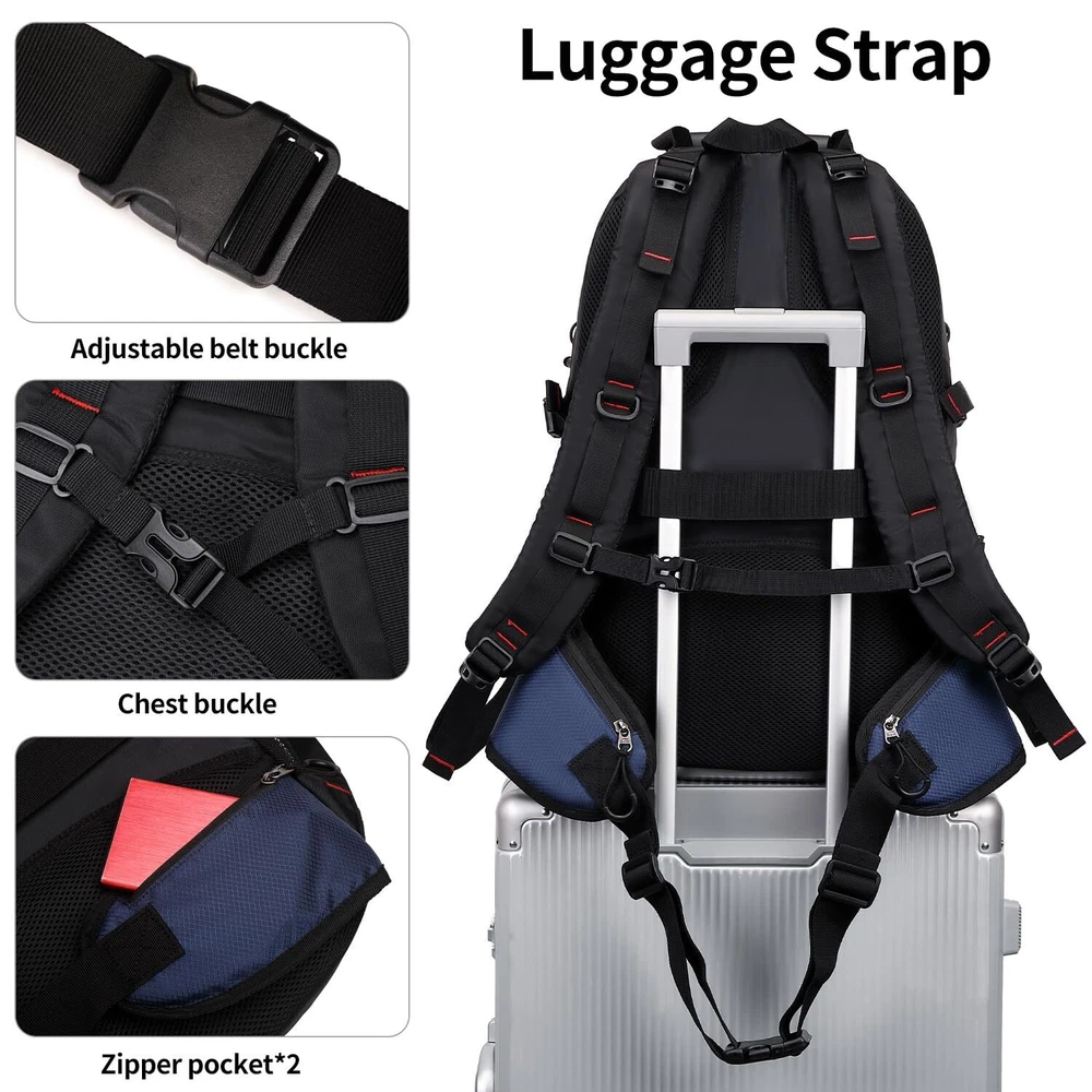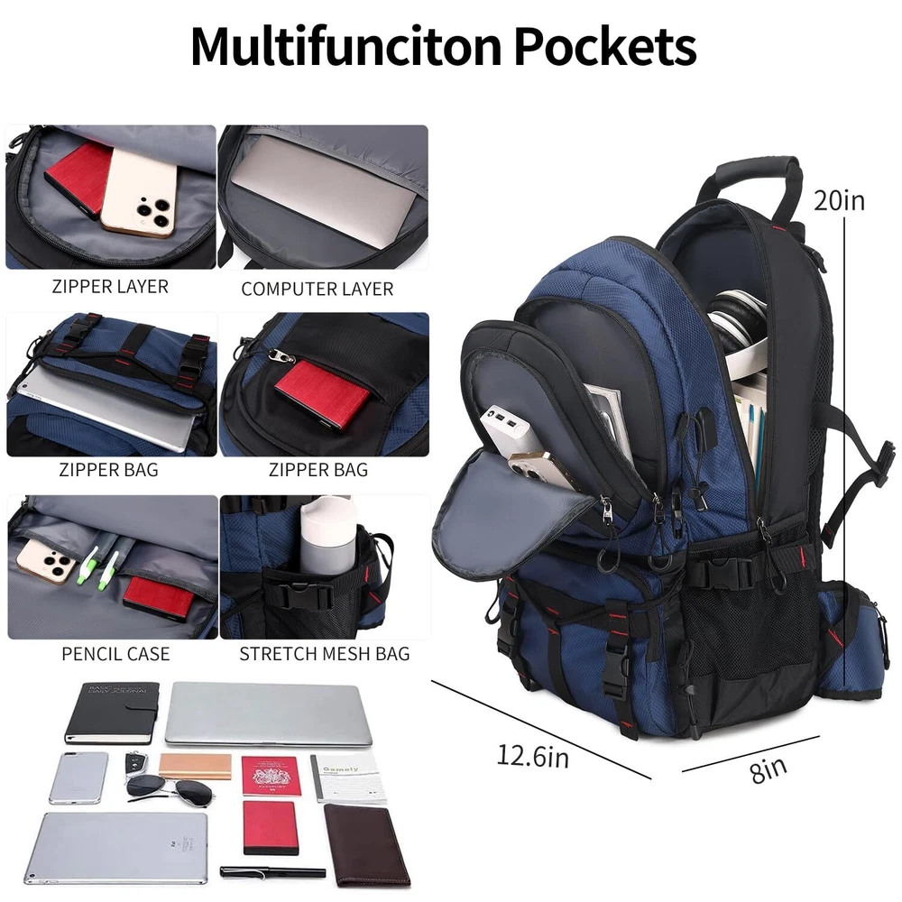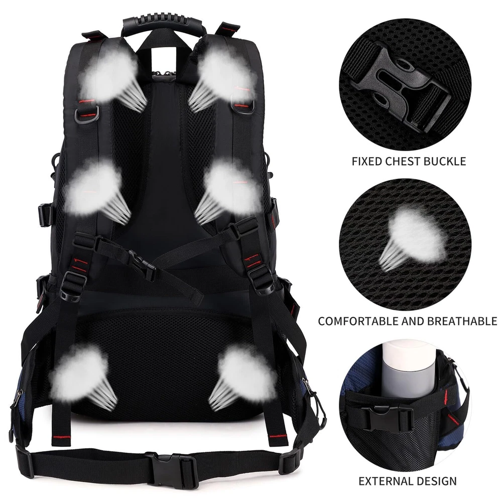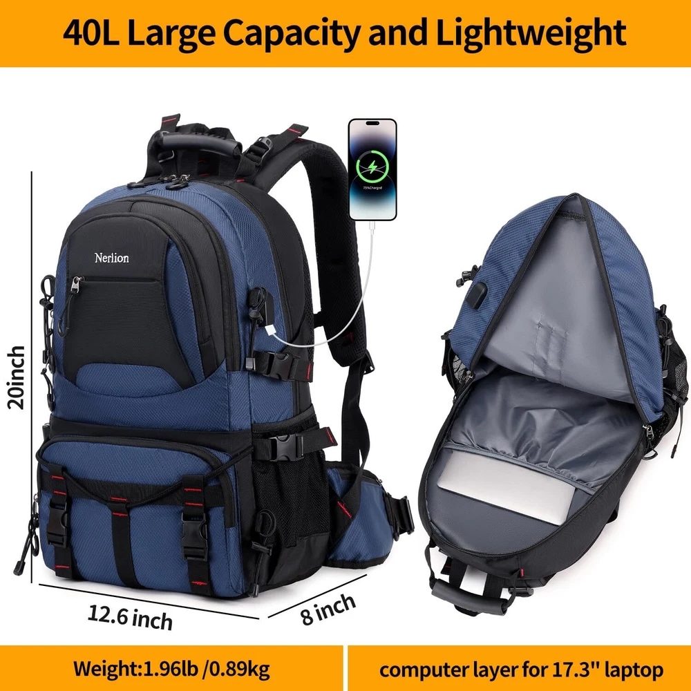 Description hiking backpack Large Capacity: With 40L storage space, this backpack features with multi-compartment design includes one main zipped compartment, several front pockets with zippers and two side pockets. Large capacity helps you easily organize all your essential items. Durable and Lightweight Backpack: Nerlion hiking backpack is made of super thick, tear resistant, waterproof and wear-resistant nylon fabric.Bag weights 0.9kg Comfortable: Breathable mesh shoulder straps with plentiful sponge padding help relieve the stress from your shoulder. The chest clip with a buckle work perfectly to distribute the pack's weight and keep it steady and centered. Functionality and safety: The luggage belt allows the backpack to be installed or slide through the luggage for easy carrying. There is a hidden anti-theft pocket on the back to protect your valuables from thieves. Suitable for international air travel and one-day travel as a travel gift. Easy to Carry: Perfect for outdoor travel,camping,hiking and fishing. It meet size requirements for most airlines. This camping backpack can be used as hiking backpack, travel bags and business bag,which is suitable for men and women.