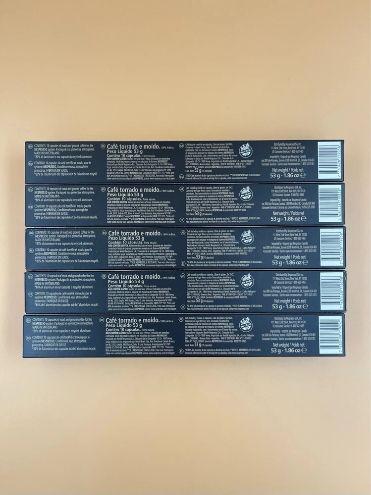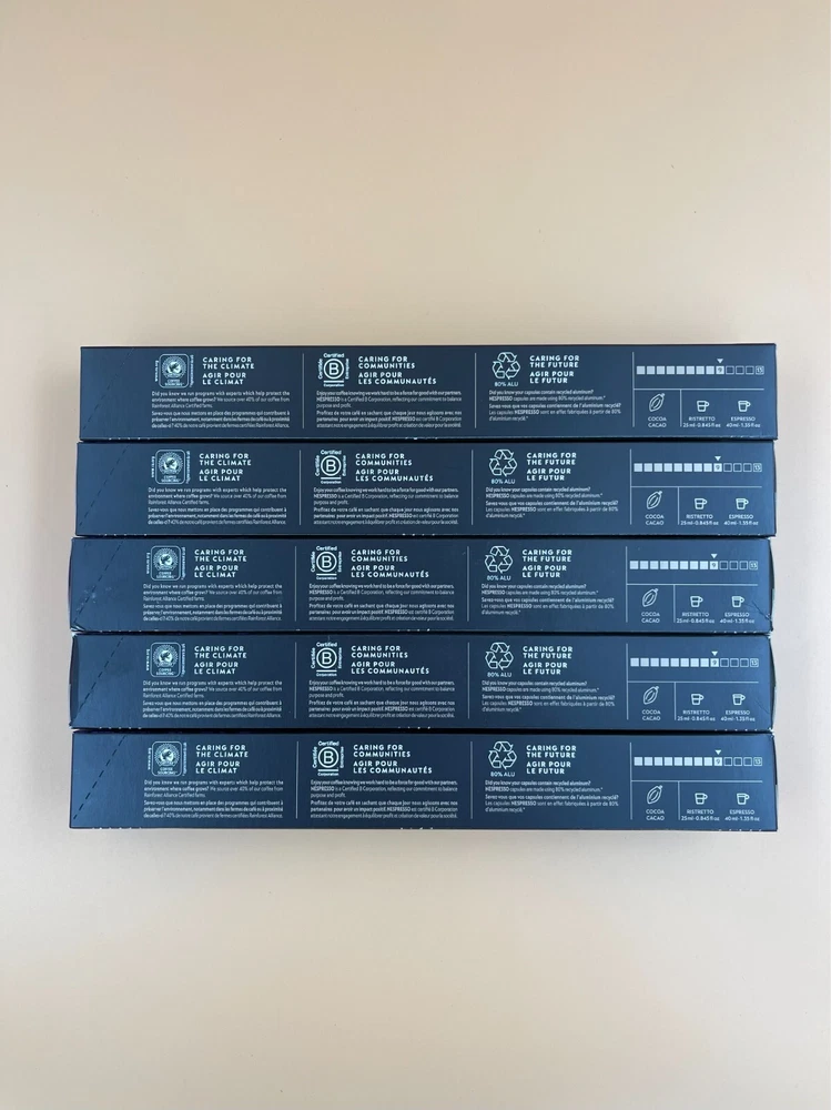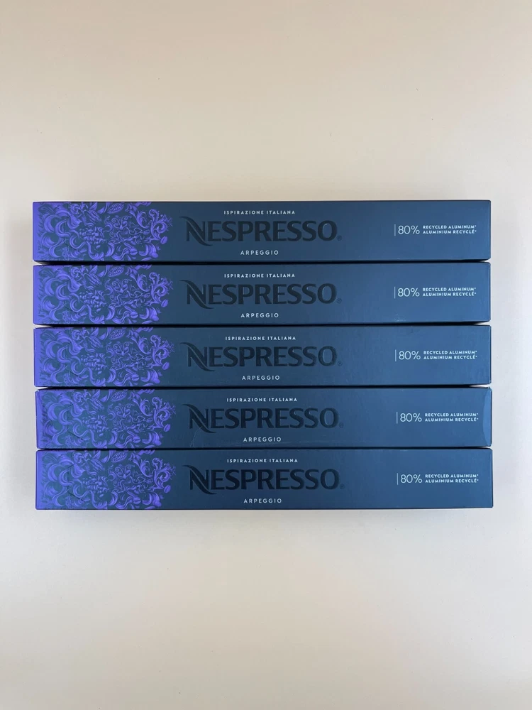 COFFEE BLEND:;Arpeggio is a;long roasted Central and South American Arabica;;dense and creamy with bold roasty and cocoa notes. The crema gives it a creamy, velvety texture that is irresistible.;Long roasted – Nespresso Intensity 9.; DARK ROAST: An intense roast of the coffee beans develops the distinct characteristics of each of Arpeggio’s coffees. It may be a blend, but it seeks to let each coffee shine.; SAVOR WITH MILK:;Arpeggio’s potent character can push through milk. It’s an intense coffee, but the sweet notes of Arabica mix well with milk froth to make this homage to Florence a characterful Latte Macchiato.; CONTENTS: 50 capsules – 10 capsules per box. Each capsule brews Ristretto 0.845 OZ and Espresso 1.35 OZ SUSTAINABILITY FIRST:;As a certified B Corporation,;Nespresso;meets the highest standards of verified social and environmental performance, joining a global movement using business as a force for good.;;Nespresso aluminum capsules are fully recyclable and guarantee coffee freshness - we provide different options for recycling your used aluminum coffee pods to fulfill our collective commitment to protecting the environment. Expires: 12/31/2024