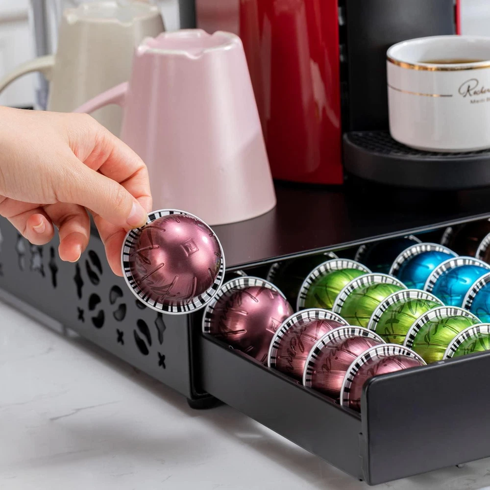 50 Pods Capacity Product dimensions: 16.07"L x 12.6"W x 3.23"H 【Elegant, Sleek and Versatile】Flagship vertuo pod hloder adopt modern design and easy to blend into the coffee bar, so that your coffee bar looks more elegant. 【50 Vertuo Capacity】Holds up to 50 pods for Nespresso Vertuo pods. This capsules holder holded up 5 boxes pods capacity with Vertuo Next, Vertuo Plus, Vertuo Evoluo ect. 【Save Space】Size:12.6''*16.07''*3.23''.You only need to use a small area to fit a large number of Nespresso pods.That's enough coffee for your entire family for a week, but takes up a lot of your little counter space. 【Sturdy Frame】Upgraded frame ensures not easily to brend like other normal pillar frame.All frame is made of metal which has longer life than plastic. 【Easy to Organize】Easy to pull out drawer and put in pods offer the best user experience. The hollow place design can be organized your coffee capsule easily.