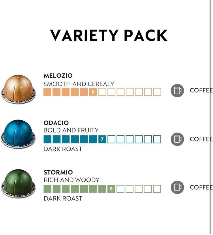 Nespresso Capsules Vertuo, Variety Pack, Medium and Dark Roast Coffee, 30 Count Brand Nespresso Item Form Capsule Flavor Medium and Dark Roast Variety Pack Caffeine Content Description Caffeinated Roast Level Dark Roast Package Information Box NESPRESSO VERTUOLINE VARIETY PACK ASSORTMENT: This Nespresso coffee assortment offers 30 Nespresso Pods in a variety of 3 best-selling coffee blends for the Nespresso VertuoLine System.10 Stormio, 10 Odacio, 10 Melozio INTENSITY: This assortment will let you explore the rich tastes of the following