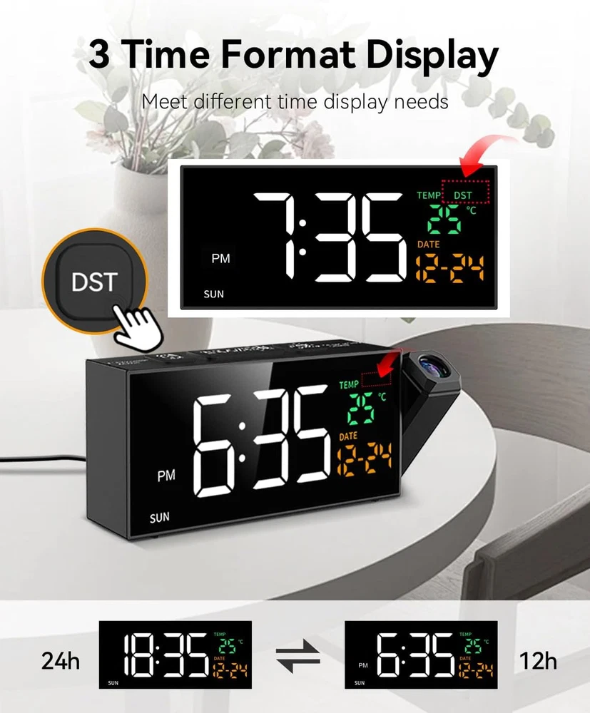 Netzu Projection Clock for Bedroom Ceiling, Alarm Clocks with 180° Black Product Details Brand: Netzu Color: Black Display Type: Digital Style: Modern Special Feature: Loud Alarm, Adjustable Brightness, Temperature Display, Projection Clock, Adjustable Volume Product Dimensions: 8.07"W x 3.07"H Power Source: Corded Electric Age Range (Description): Teenager Senior Room Type: Bedroom Shape: Rectangular Indoor/Outdoor Usage: Indoor Material: Plastic Frame Material: Plastic Are Batteries Included: No Mounting Type: Tabletop Alarm Clock: Yes Watch Movement: Quartz Number of Items: 1 Operation Mode: Electrical Dial Color: [PO] Possible Black Manufacturer: Netzu Item Weight: 10.9 ounces Item model number: 6210P Projection Alarm Clock - Project the time onto your wall or ceiling, ensuring you can easily check the time at any moment in your bedroom. With a clear projection distance of 1.6-11.4 feet and a 350° rotating arm for optimal positioning, you'll always have the time in sight.The projected image provides 4 brightness levels and can be flipped 180 ° to accommodate different sleep directions. Adjustable Volume and Sound Choices - This alarm clock features 10 delightful alarm tones to choose from, providing a pleasant start to your day. Additionally, it offers four adjustable volume levels, allowing you to set the perfect intensity for a gentle or more robust wake-up call. Manual DST Adjustment Feature - Simply hold down the DST button to move the alarm time forward by an hour when Daylight Saving Time starts, and backward by an hour when it ends. This convenient feature keeps your clock in sync with the changing seasons effortlessly. 5 Brightness Levels - This plug-in alarm clock offers 5 levels of brightness adjustment, allowing you to customize the display to suit any lighting condition. Whether you need a bright display during the day or a dim light at night, this clock provides the perfect level of illumination for your comfort.