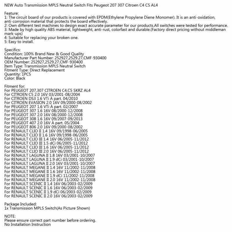 Gas Tank Fuel Cock Valve Petcock fit for Yamaha YZF R1 XJ900 YZ80 4KM-24500-00 18.76 USD Free shipping For BMW E46 323i 325i 328i 330i M3 305 02-06 LHD Center Console Trim Base BE F13 70.61 USD 74.33 USD Free shipping 5% off NEW Set of 4 Door Handles Chrome For Chrysler 300 & 300C 2005-2010 4589009AH USA 74.87 USD Free shipping 6L80 6L90 Transmission Rebuild 1-2-3-4 3-5-Reverse Clutch Seals Pack O-Rings 20.89 USD 21.99 USD Free shipping 5% off 7" LCD Digitizer Touch-Screen C070EAT01.0 For Uconnect Radios VP2 2018-2022 83.4 USD 87.79 USD Free shipping 5% off 1pcs Fuel Injectors 7561277 13537561277 Fit BMW N45 N46N E93 320I 2.0L 17.87 USD Free shipping CARBURETOR CARB REPAIR REBUILD KIT FOR GY6 125CC Aprilia PD24J BMW ATV Go Kart 15.79 USD Free shipping Oil Cooler Filter Housing Seal Gasket O-ring 21304-JA11A For Nissan Armada Titan 10.68 USD Free shipping M18X1.5 Female Aluminum Weld On Fitting Bung US 11.2 USD 11.79 USD Free shipping 5% off CNC Adjustable Kickstand Side Stand Fit HONDA CBR 600 1000 RR 600RR 1000RR 41.86 USD Free shipping 18213-65J00 Upstream Lambda O2 Sensor For Suzuki Grand Vitara 1.6 2.0L 06-15 29.79 USD Free shipping Pair Silver Motorcycle Handlebar Riser Kit Moves Bar Up For BMW F800GS 2008-2017 33.13 USD 34.87 USD Free shipping 5% off A Fantastic Shop Send us a message Our Store Seller Profile Feedbacks Save this seller Contact Neutral Safety switch 2529.27 For Peugeot and Citroen Multifunction YU NEW Auto Transmission MPLS Neutral Switch Fits Peugeot 207 307 Citroen C4 C5 AL4 Feature: 1: The circuit board of our products is covered with EPDM(Ethylene Propylene Diene Monomer). It is an anti-oxidation, anti-corrosion material that protects the board effectively. 2: Own different test machines to design exact accurate parameter for our products.All switches were tested for performance. 3: Made by high quality ABS material, lightweight, anti-rust, colorfast and durable.(Factory direct pricing without middleman mark-ups) 4: Suitable for replacing your broken one. 5: Easy to install. Specifics: Condition: 100% Brand New ; Good Quality Manufacturer Part Number: 252927,2529.27,CMF-930400 OEM Number: 252927,2529.27,CMF-930400 Item Type: Transmission MPLS Neutral Switch Fitment Type: Direct Replacement Quantity: 1PCS Color: Black Fitment for: For PEUGEOT 207,307 CITROEN C4,C5 SKRZ AL4 For CITROEN C5 2.0 16V 03/2001-08/2004 For CITROEN DS3 1.6 VTi À part. 04/2010 For CITROEN EVASION 2.0 16V 09/2000-08/2002 For PEUGEOT 207 1.6 VTi À part. 02/2007 For PEUGEOT 307 1.6 16V 08/2000-12/2008 For PEUGEOT 307 2.0 16V 08/2000-12/2008 For PEUGEOT 308 1.6 16V 09/2007-09/2013 For PEUGEOT 407 2.0 16V À part. 05/2004 For PEUGEOT 806 2.0 16V 09/2000-08/2002 For RENAULT CLIO II 1.4 16V 09/1998-06/2005 For RENAULT CLIO II 1.6 16V 09/1998-06/2005 For RENAULT CLIO III 1.4 16V 06/2005-11/2012 For RENAULT CLIO III 1.5 dCi 06/2005-11/2012 For RENAULT CLIO III 1.6 16V 06/2005-11/2012 For RENAULT CLIO III 2.0 16V 06/2005-11/2012 For RENAULT LAGUNA II 1.8 16V 03/2001-10/2007 For RENAULT LAGUNA II 1.9 dCi 03/2001-10/2007 For RENAULT LAGUNA II 2.0 16V 03/2001-10/2007 For RENAULT MEGANE II 1.4 16V 11/2002-11/2008 For RENAULT MEGANE II 1.6 16V 11/2002-11/2008 For RENAULT MEGANE II 1.9 dCi 11/2002-11/2008 For RENAULT MEGANE II 2.0 16V 11/2002-11/2008 For RENAULT SCENIC II 1.4 16V 06/2003-02/2009 For RENAULT SCENIC II 1.6 16V 06/2003-02/2009 For RENAULT SCENIC II 1.9 dCi 06/2003-02/2009 For RENAULT SCENIC II 2.0 16V 06/2003-02/2009 Package Included: 1x Transmission MPLS Switch(As Picture Shown) NOTE: Please ensure correct part number before ordering. No Installation Instruction About US About Our Items We strive to describe all items accurately and thoroughly, with the utmost care and attention to detail. However, to ensure a mutually satisfactory transaction, we kindly ask for your assistance in thoroughly reviewing the item description and photos, and addressing any questions before placing a bid. Customer Satisfaction We stand behind our commitment with exceptional service, a 100% money-back guarantee, and a dedication to customer satisfaction. I am readily available to address any inquiries or concerns you may have, both before and after your purchase. Our aim is to ensure your shopping experience is enjoyable and that you're delighted with your purchase. Feedback Your feedback is crucial to our business's success. If you're satisfied with your purchase and the service you received, we would greatly appreciate your positive feedback, along with an overall Detailed Selling Rating (DSR) of 5. Please take a moment to leave us positive feedback. Our eBay account is set up to automatically reciprocate positive feedback once yours is received. If you're considering leaving neutral/negative feedback or opening an eBay/PayPal case, we encourage you to reach out to us immediately. We're committed to resolving any issues to the best of our ability. Shipping Parcel will be shipped using Standard shipping method. For security purposes, items will be shipped exclusively to the confirmed address on Paypal. Please ensure your Shipping address is up to date before proceeding with payment. Estimated delivery time within the United States ranges from 3 to 10 business days, depending on your location. Returns We accept returns within 60 days from the date the buyer receives the item. If the item is found to be defective upon receipt, the customer has up to 30 days from the date of receipt to request an exchange for a new item or a refund. For returns due to a change of mind, we accept items in their original selling condition. However, if the package has been opened due to a mistaken order, it does not qualify for our return policy. Please note that the buyer is responsible for covering the cost of return postage. If you encounter any issues, please reach out to us via eBay message, and we'll respond within 24 hours. 02E Automatic Trans 6 Speed DSG Clutch Repair Kit For VW Audi MK5 MK6 TDI 2.0T 299.87 USD Free shipping